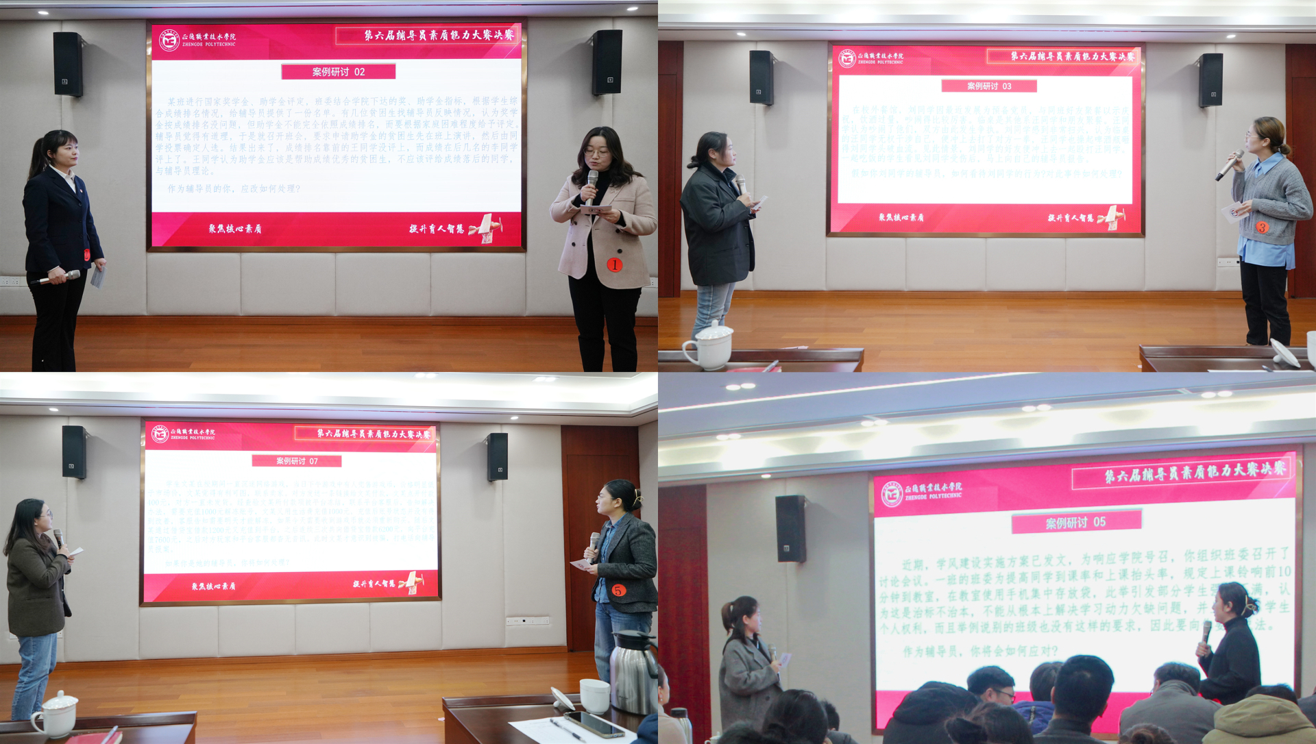 案例研讨环节,参赛的辅导员们通过“我提问,你回答”的方式,围绕学生工作常见案例共同辨析原因、研讨对策、总结规律,充分展现春满四合院 辅导员综合运用理论知识,分析问题、研判问题、解决问题的能力,让观众深刻感受到辅导员们在实际工作中所发挥的重要作用。