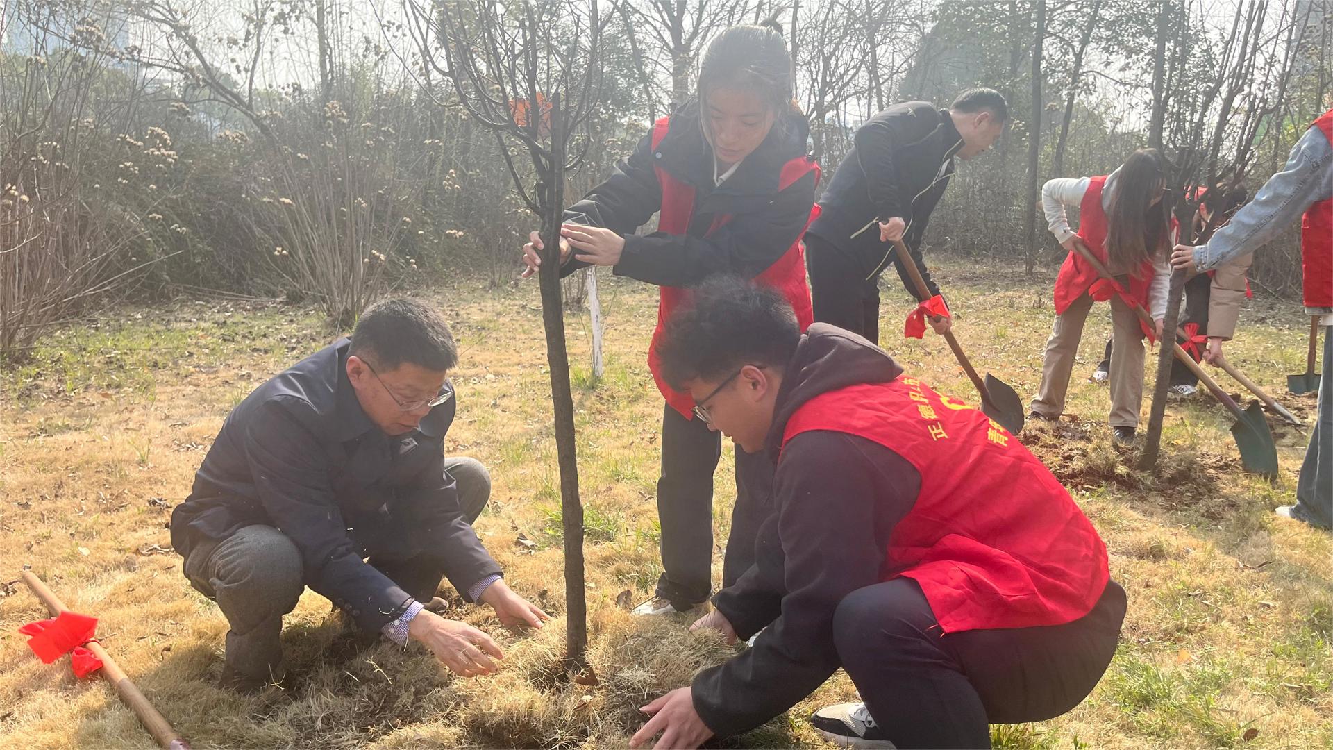 植树现场,师生热情高涨、干劲十足,有的挥锹培土、扶树正苗,有的填坑夯苗、围堰浇水,大家各司其职、配合默契、有条不紊。每种下一棵树苗,都认真填土踩实,确保栽一棵活一棵,栽一片绿一片。经过一上午的辛勤劳作,一棵棵新种下的树苗在春日里昂首挺立,焕发出勃勃生机,在阳光下焕发出绿色希望。