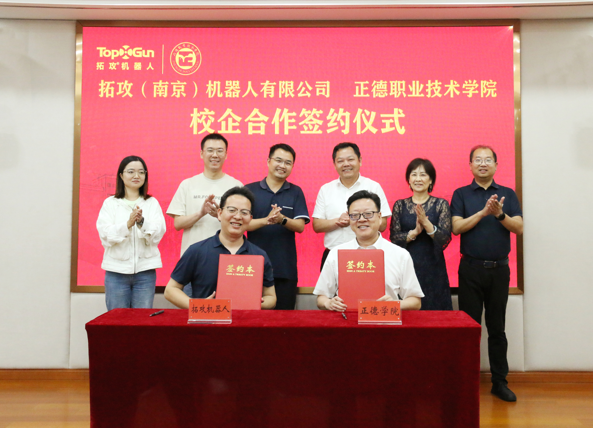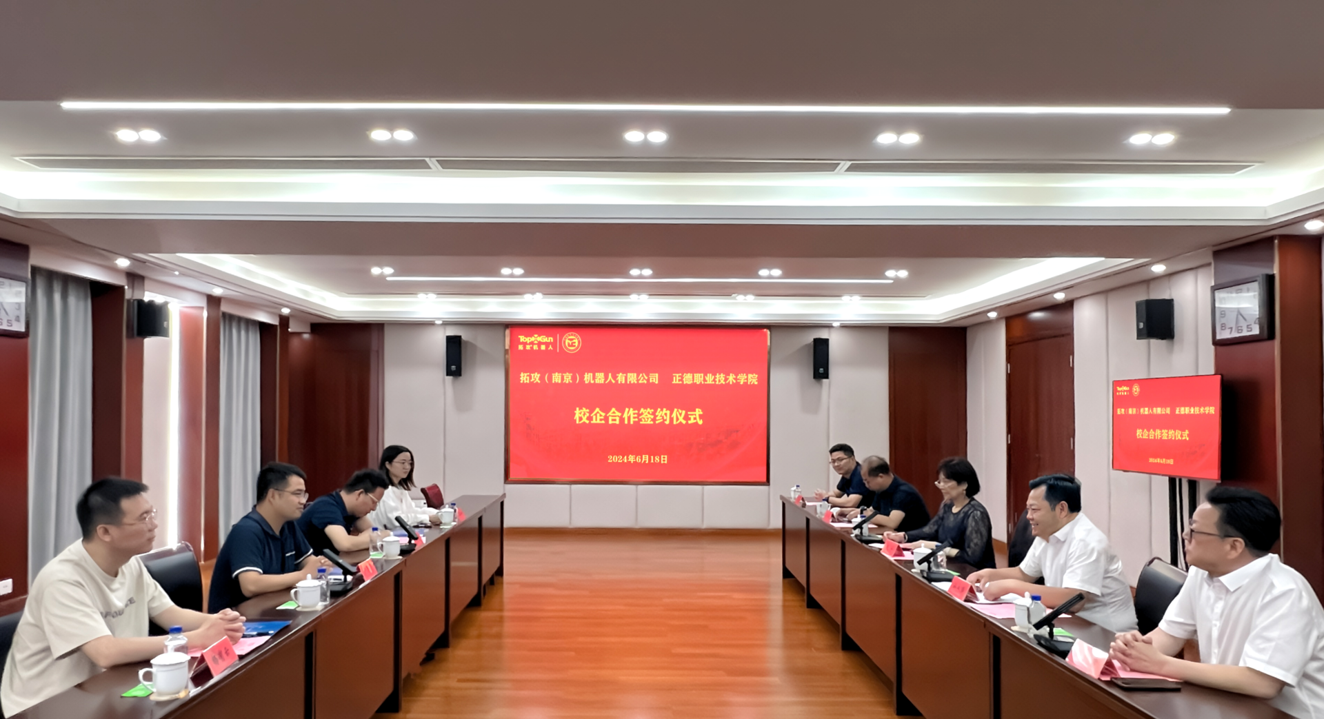 6月18日,春满四合院 与拓攻(南京)机器人有限公司举行了校企合作签约仪式。拓攻机器人联席CEO尹亮亮,自动驾驶技术研究院院长徐进、教育事业部经理杨有运、工业设计总监田静,正德学院院长孙永荣,副院长赵宇、赵凯雷,院长助理、党政办主任王伟,院长助理、招生就业处处长王墀以及相关部门负责人出席签约仪式。仪式由赵宇主持。