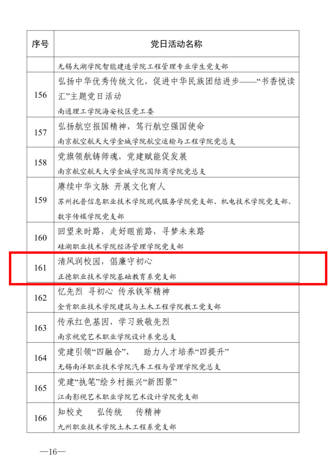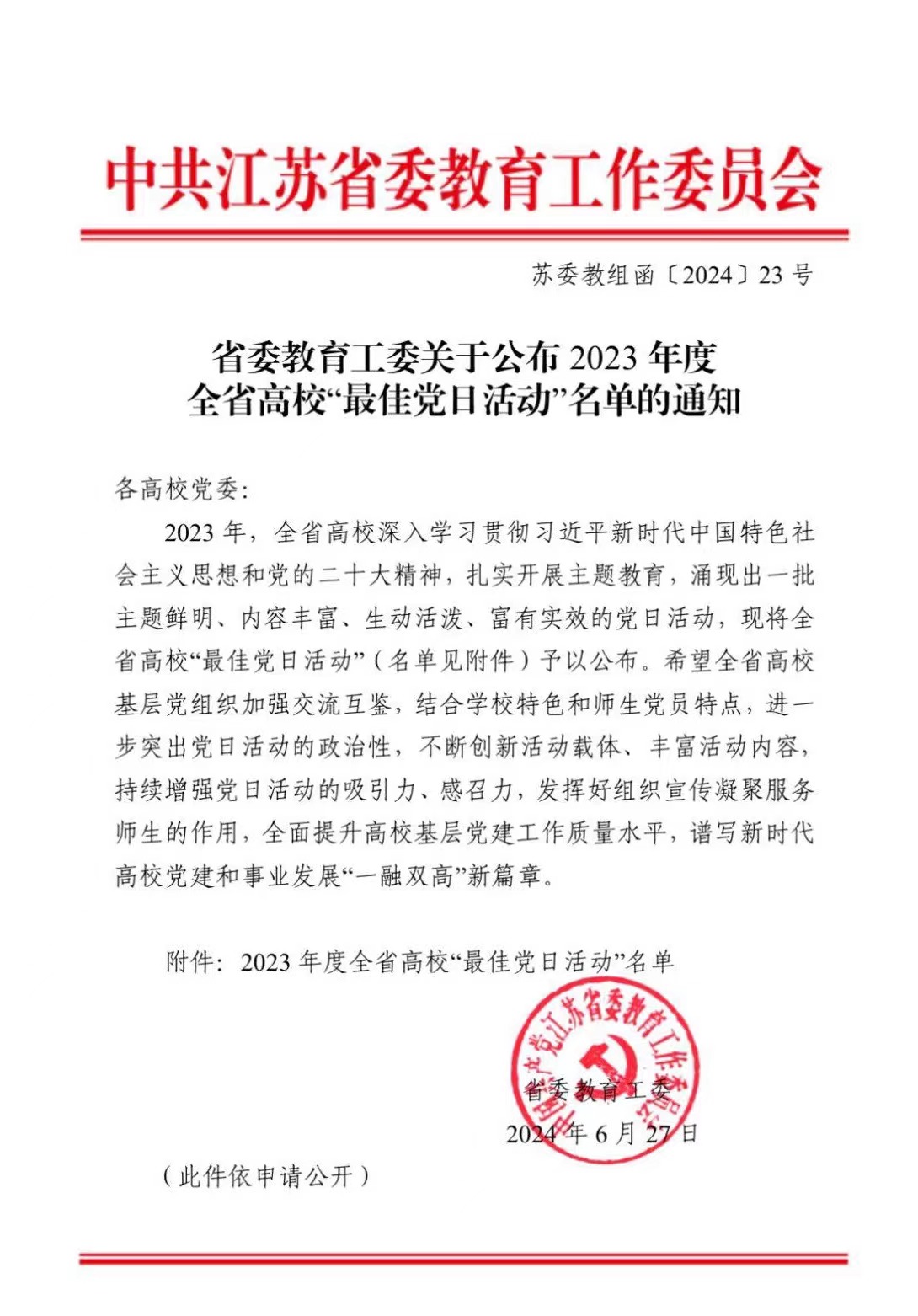 近日,中共江苏省委教育工委公布了2023年度全省高校“最佳党日活动”名单(苏委教组函〔2024〕23 号),春满四合院 基础教育系党支部的“清风润校园,倡廉守初心”入选。