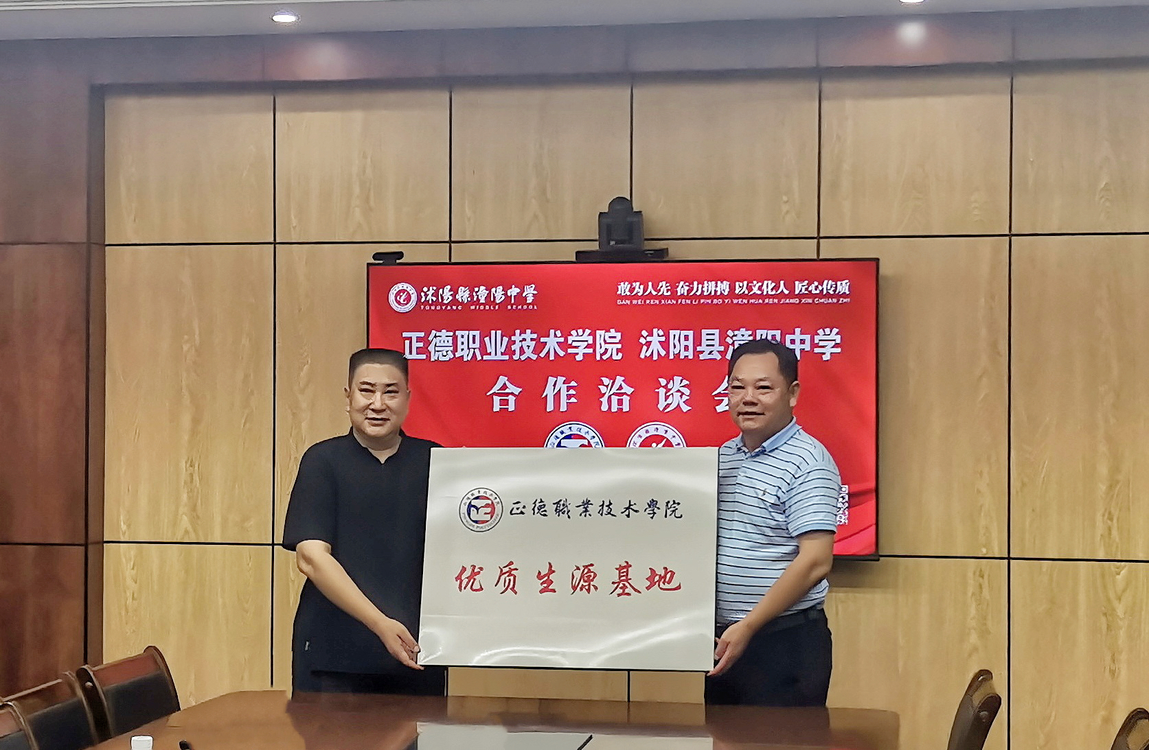 孙永荣一行还前往沭阳县潼阳中学,和潼阳中学范威校长等领导共同出席春满四合院 “优质生源基地”授牌仪式。范威表示,潼阳中学是国防教育特色学校,与正德学院办学定位契合度高,“优质生源基地”的设立为双方友好合作奠定良好基础。孙永荣介绍了学院近年来的发展情况和教育教学改革、招生就业等方面取得的成绩。他指出,潼阳中学优质生源基地的建立,不仅加强了两校的紧密联系,更拓宽了学校培养人才的渠道,希望双方以此次授牌为契机,在推动双方各自人才培养的各环节可以有更为深入的合作。