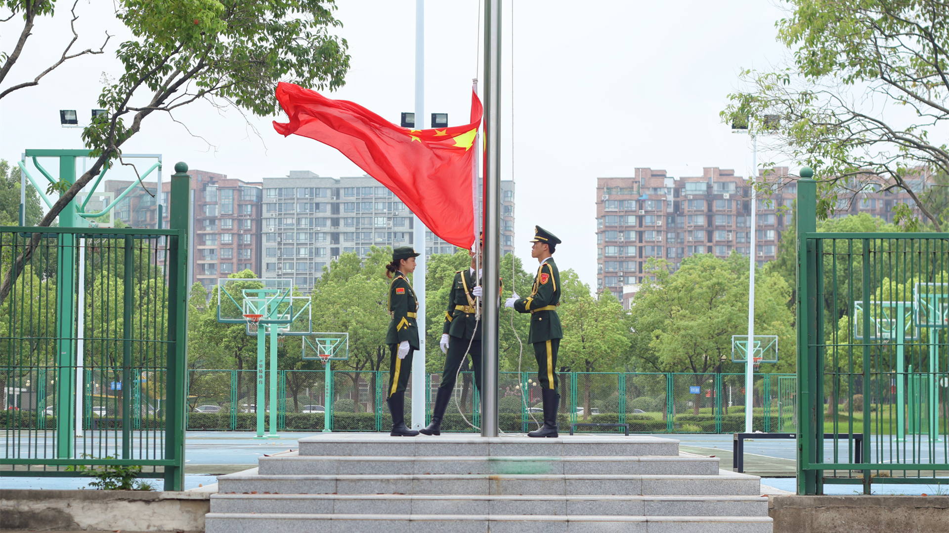 国旗护卫队在庄严肃穆的国歌声中升起五星红旗,正式拉开典礼的帷幕。