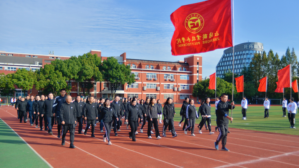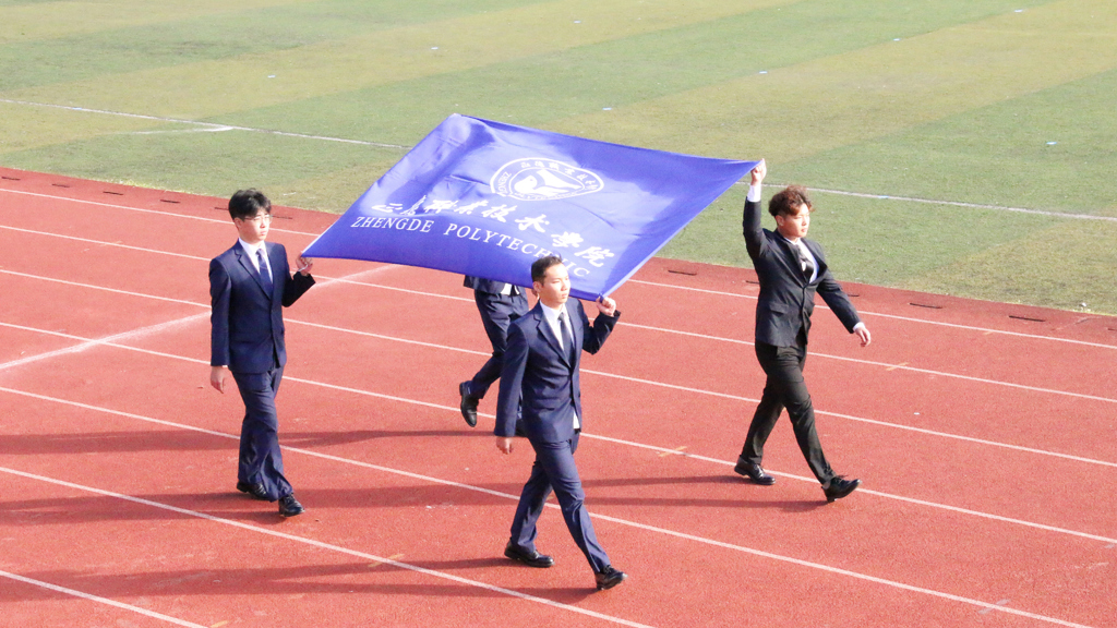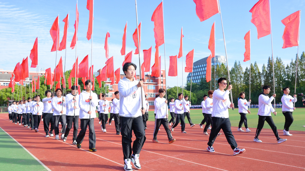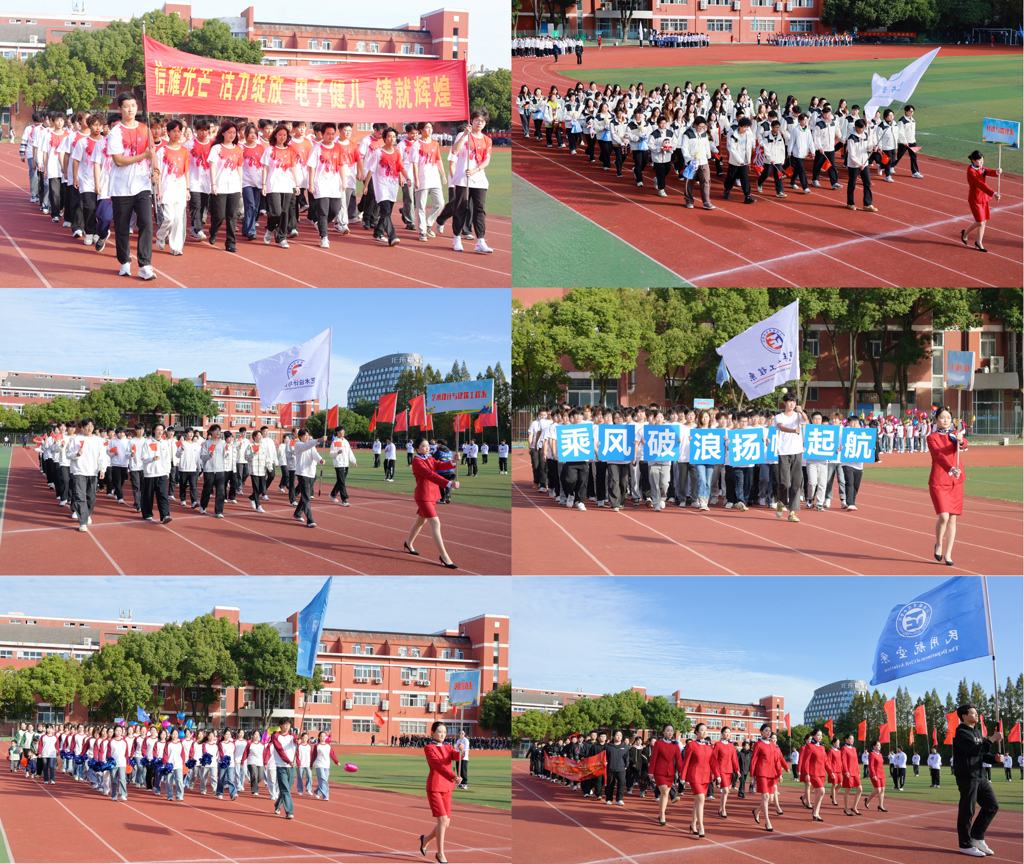 随着激昂的《运动员进行曲》响起,由国旗、校旗和红旗组成的前导队,各系学生及教职工方队依次入场。