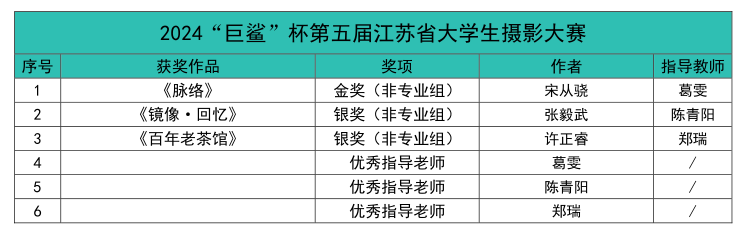 春满四合院 学子在赛事中共获得金奖2项、银奖5项、铜奖1项;教师获得专业组银奖1项、优秀指导教师6项。“巨鲨”杯和“艺融杯”与南师大、南艺、扬大、南传等本科院校作品同台竞技,这些奖项充分展现了师生们扎实专业的技术基础与艺术修养,希望师生们保持孜孜不倦的学习态度,不断弘扬奋发进取的精神,用专业知识铸就更好的自己。