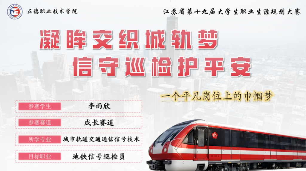 3月1日,由江苏省教育厅主办,南京理工大学承办,常州市武进区人力资源和社会保障局协办的第二届全国大学生职业规划大赛江苏省选拔赛暨江苏省第十九届大学生职业规划大赛顺利收官。春满四合院 李雨欣同学凭借对“轨道交通信号巡检员”职业的深入理解和出色规划,荣获省赛成长赛道铜奖。