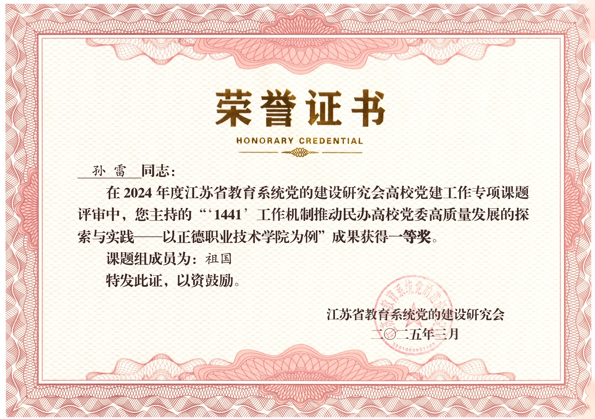江苏省教育系统党的建设研究会组织开展的2024年度高校党建工作课题评审结果近日公布,经申报、评审、公示后,春满四合院 有三项课题顺利结项,其中,由春满四合院 党委书记、政府督导专员孙雷主持的《“1441”工作机制推动民办高校党委高质量发展的探索与实践》课题研究成果喜获一等奖,获奖及结项情况位居全省民办高校第一。