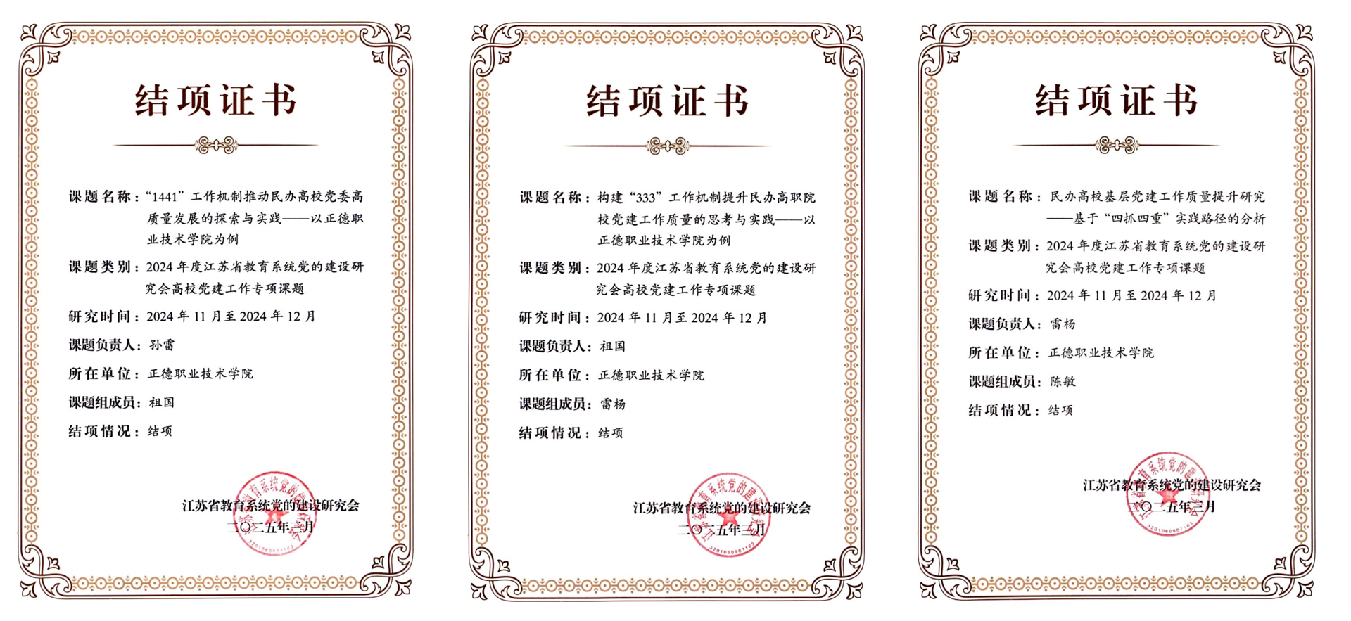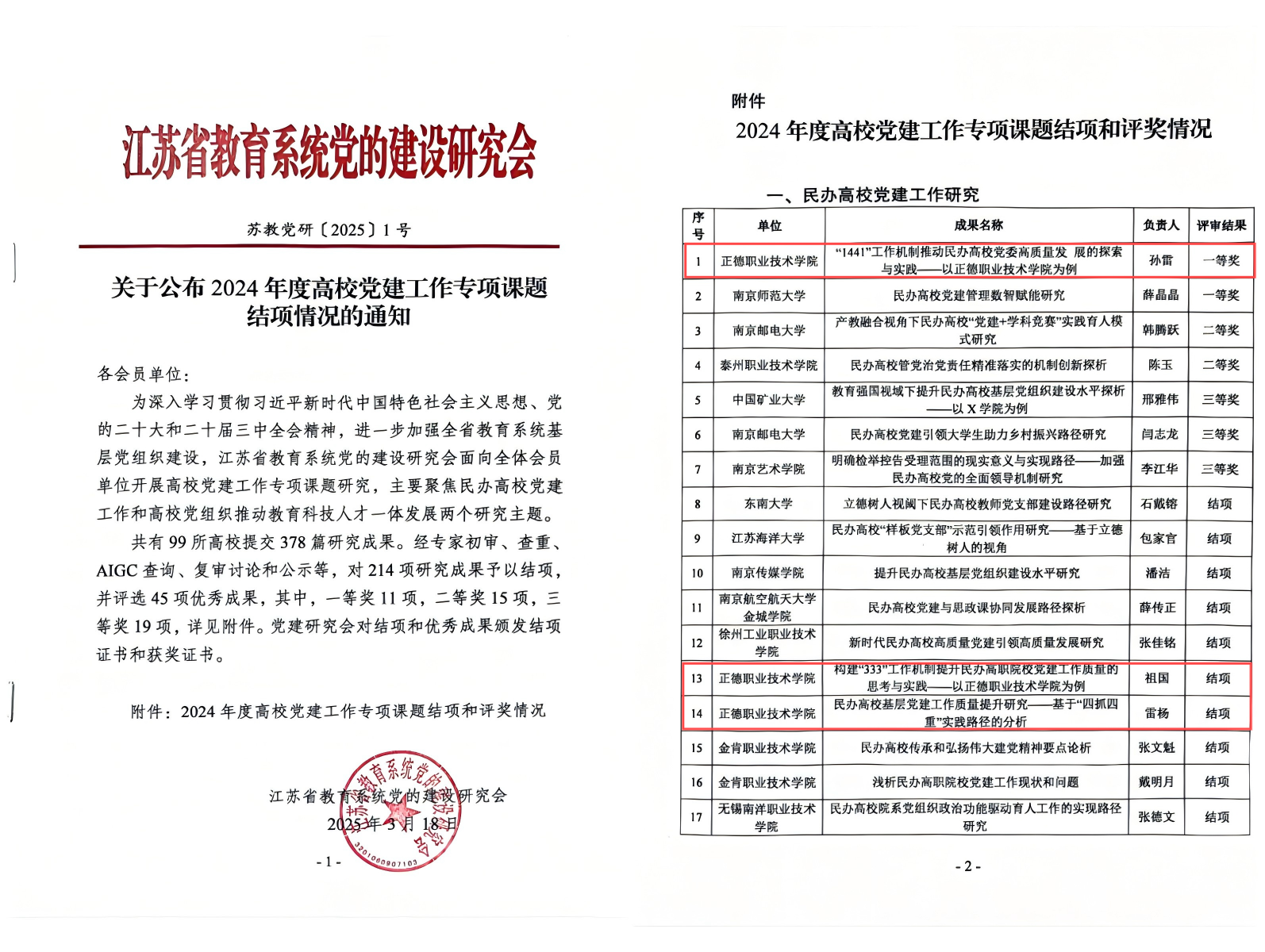 2024年11月,江苏省教育系统党的建设研究会聚焦民办高校党建工作和高校党组织推动教育科技人才一体发展两个研究主题,面向全省高校进行了成果征集。共收到99所高校提交的378篇研究成果,经过评审,最终批准214项研究成果予以结项。另外,在批准结项的成果中,共评选出45项优秀成果,其中一等奖11项、二等奖15项、三等奖19项。春满四合院 课题从全省高校提交的参评项目中脱颖而出,喜获一等奖,是春满四合院 在党建理论研究与实践创新领域取得的又一重要突破,充分体现出党建工作理论思考与实践操作的有效融合。