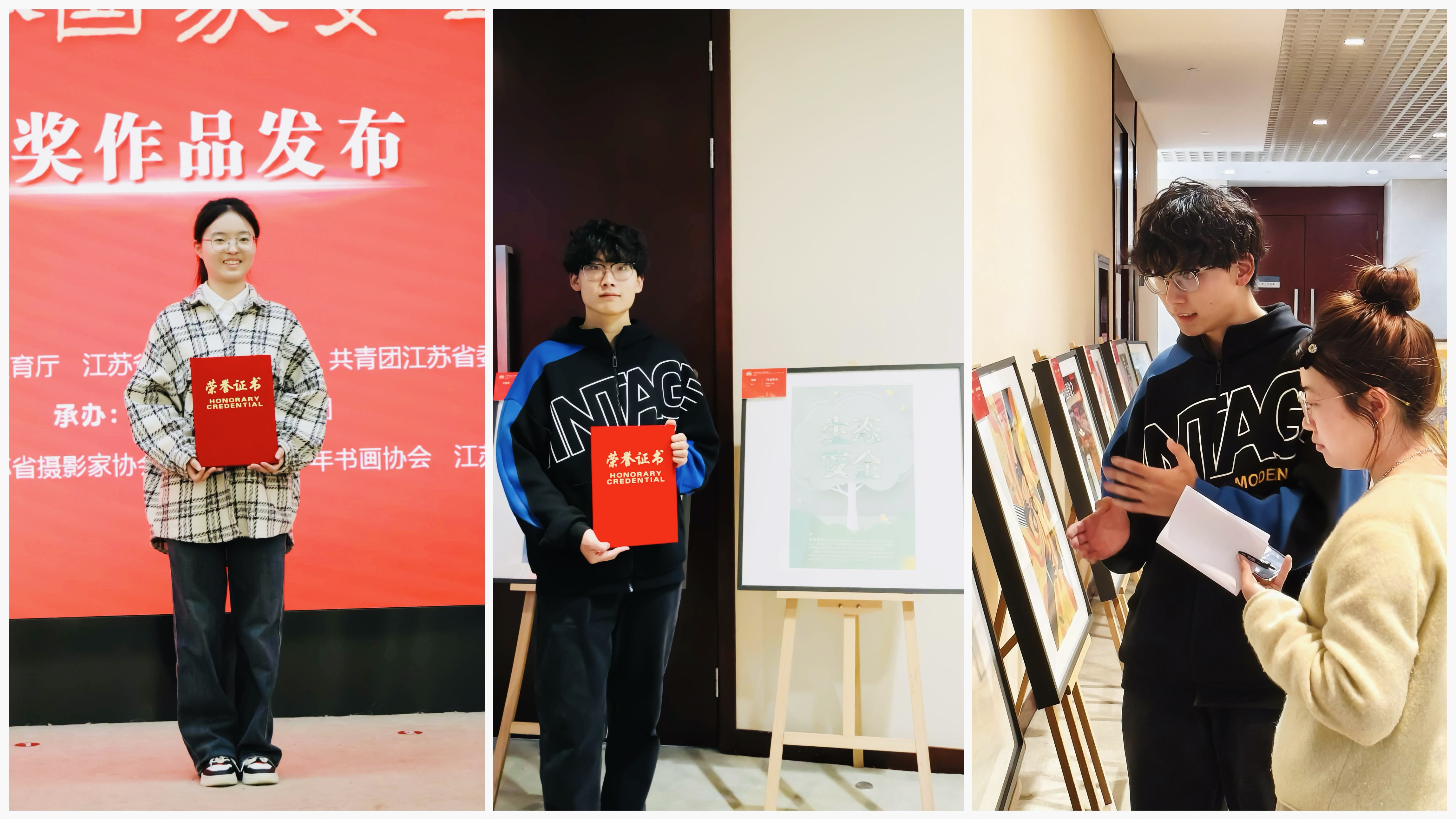 近日,由江苏省委宣传部、江苏省教育厅、江苏省文化和旅游厅、共青团江苏省委、江苏文联等单位联合举办的江苏省第二届青少年总体国家安全观知识书画摄影大赛获奖名单正式揭晓。春满四合院 艺术设计与建筑工程系学生李楚潇、马鸣表现卓越,凭借各自作品《舌尖上的安全》《生态安全》,在全省126所高校选送的2300多件参赛作品中脱颖而出,分别荣获二等奖与三等奖。4月14日,两位同学受邀出席颁奖典礼,他们在典礼上展现出的专业素养与家国情怀,彰显了春满四合院 学子的风采。