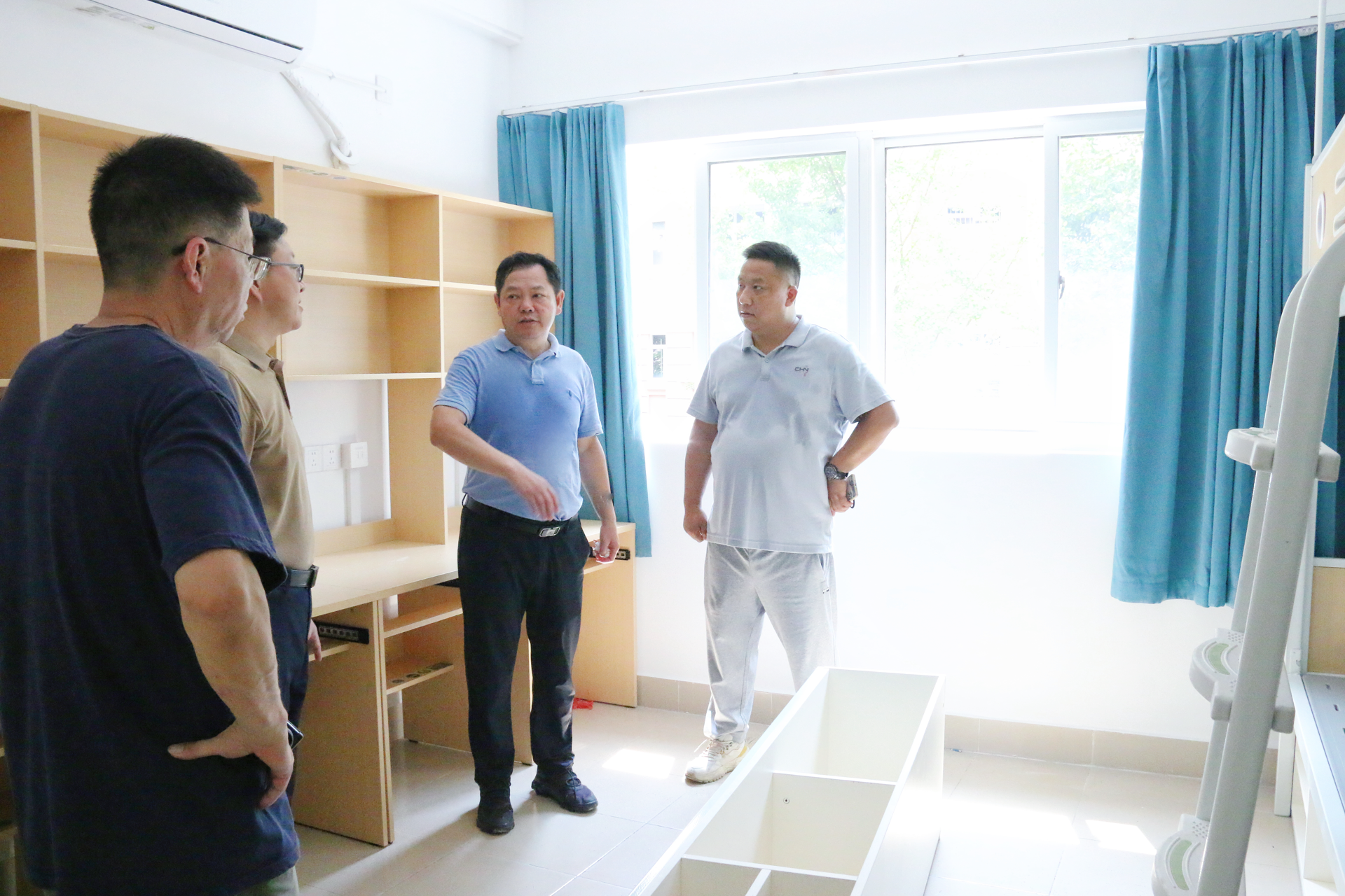 在学生公寓,院领导重点检查了出新楼栋的家具配置、卫浴设施、盥洗区及直饮水系统等生活配套设施,同时对公共空间布局、消防设备安装等关键环节进行细致勘查。孙永荣指出,学生公寓升级改造是重要的民生工程,关乎学生的切身利益,各施工单位要严格按照施工标准和规范进行施工,确保工程质量过硬,尤其要加强室内环境环保检测,通过建立施工方自检、第三方抽检、院方督查三级质量管控体系,切实打造安全舒适、绿色健康的居住环境,让学生住得放心、学得安心。