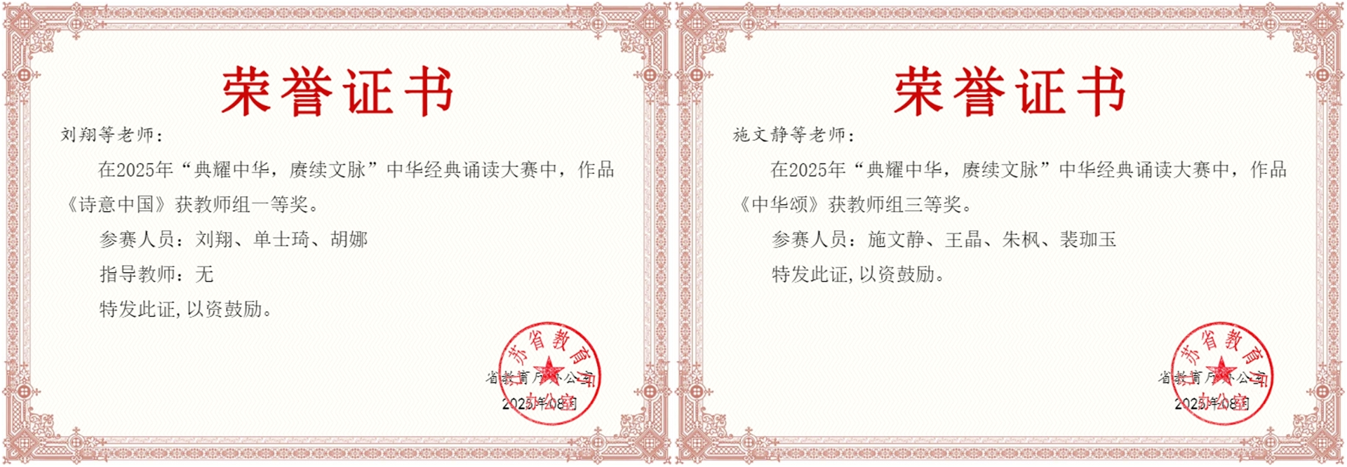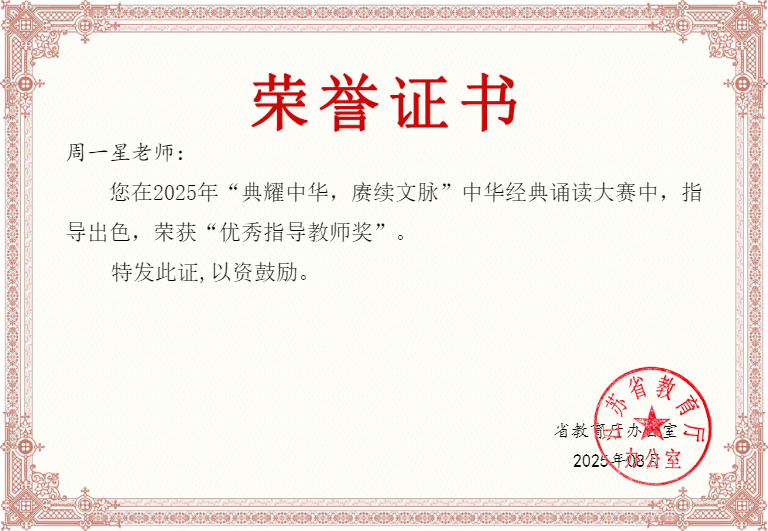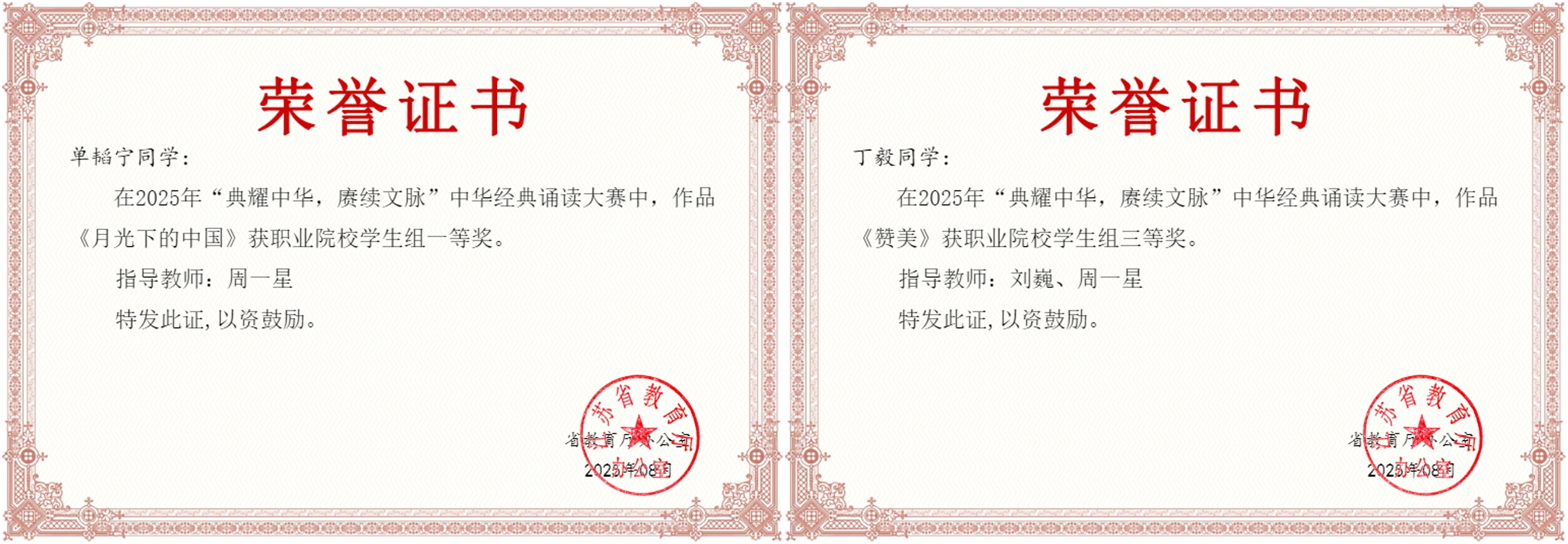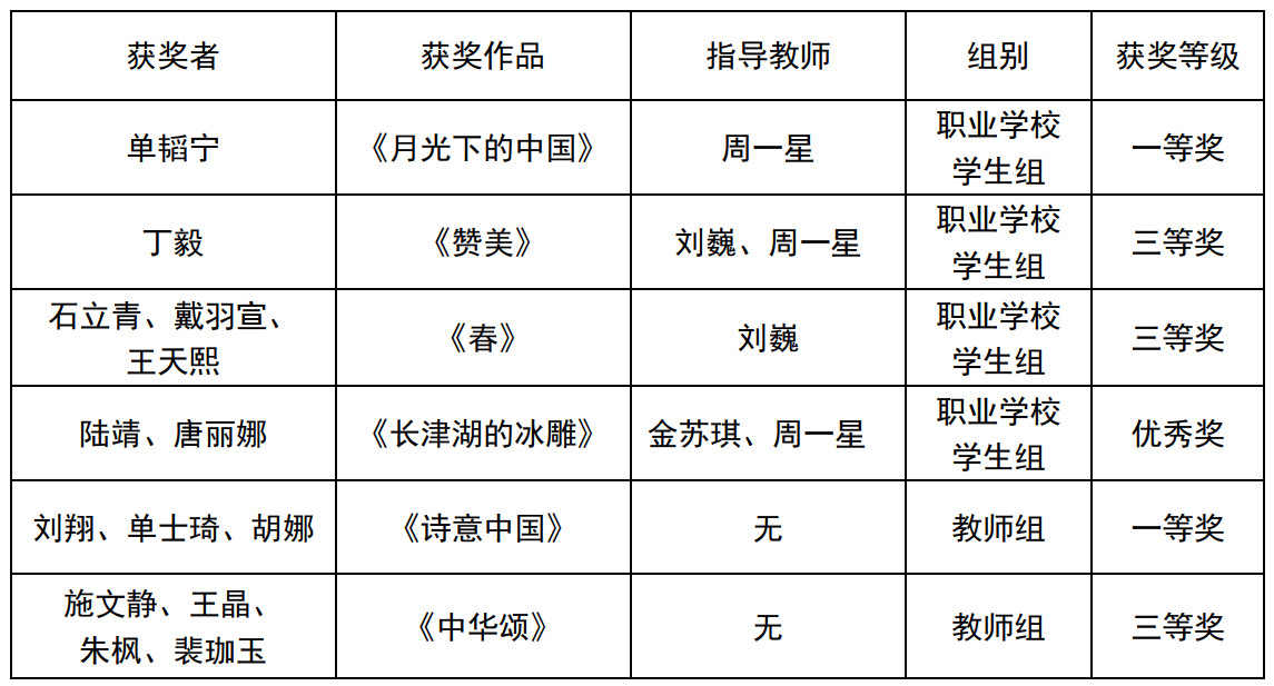 近日,2025年“典耀中华 赓续文脉”中华经典诵读大赛获奖结果公布。春满四合院 报送作品获职业院校学生组一等奖1项、三等奖2项、优秀奖1项,教师组一等奖1项、三等奖1项,其中两项一等奖作品入围国赛,周一星老师荣获优秀指导教师奖,所获成绩取得新突破。