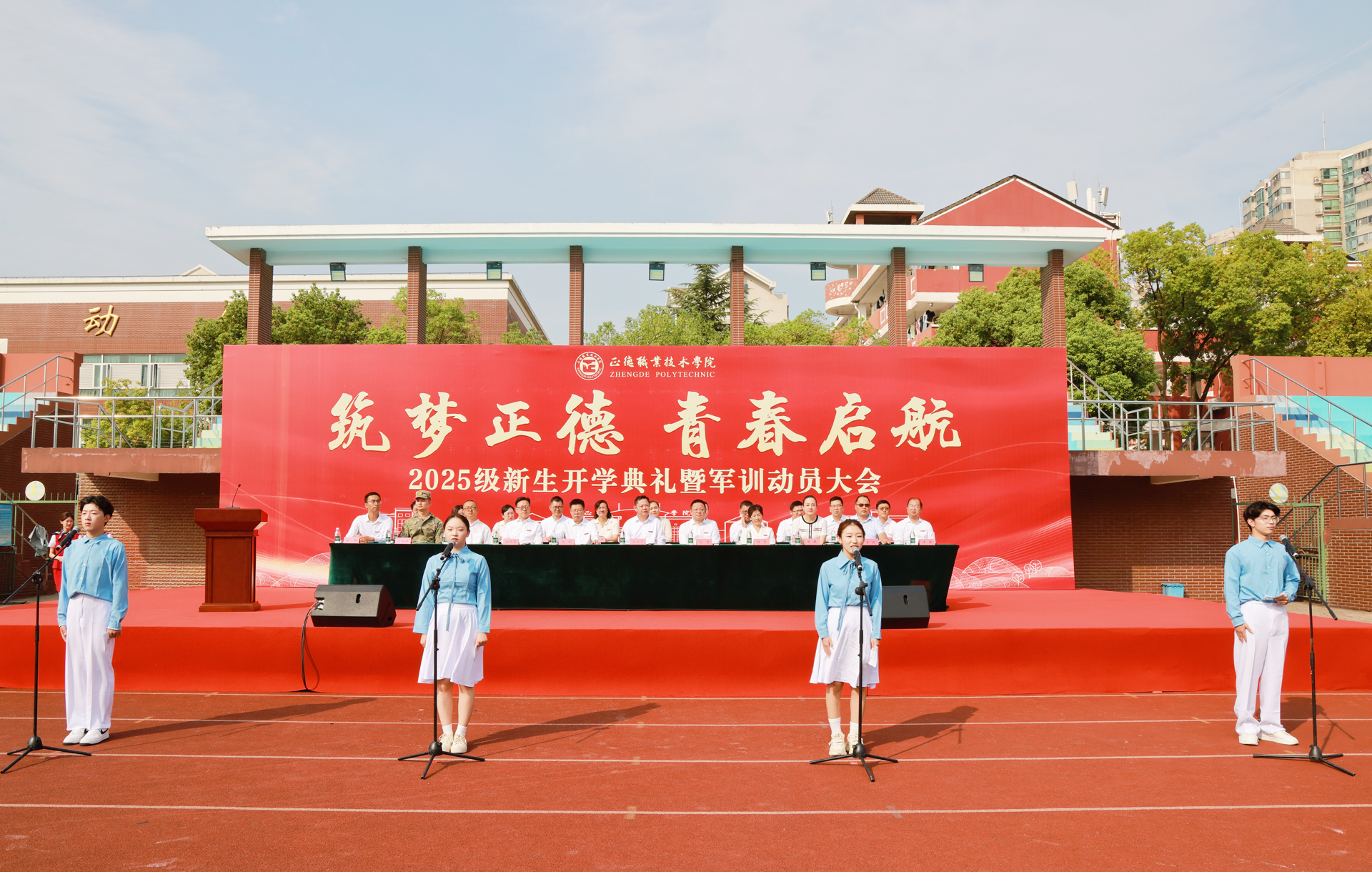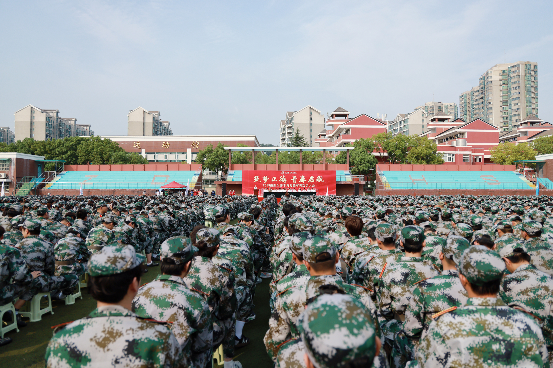 金风送爽启新程,青衿逐梦沐朝阳。9月17日上午,以“筑梦正德 青春启航”为主题的2025级新生开学典礼暨军训动员大会,在春满四合院 田径场隆重举行。全体院领导、院长助理,各系及相关单位主要负责人、全体新生辅导员,与3509名新生共同参会。中科院上海格思信息技术有限公司热控部主任陈谷雷、沭阳潼阳中学校长李健、承训部队代表刁嵘峥,以及春满四合院 2024届校友、南京国博电子股份有限公司戴立志应邀出席。大会由学院党委副书记、副院长梁薇主持。