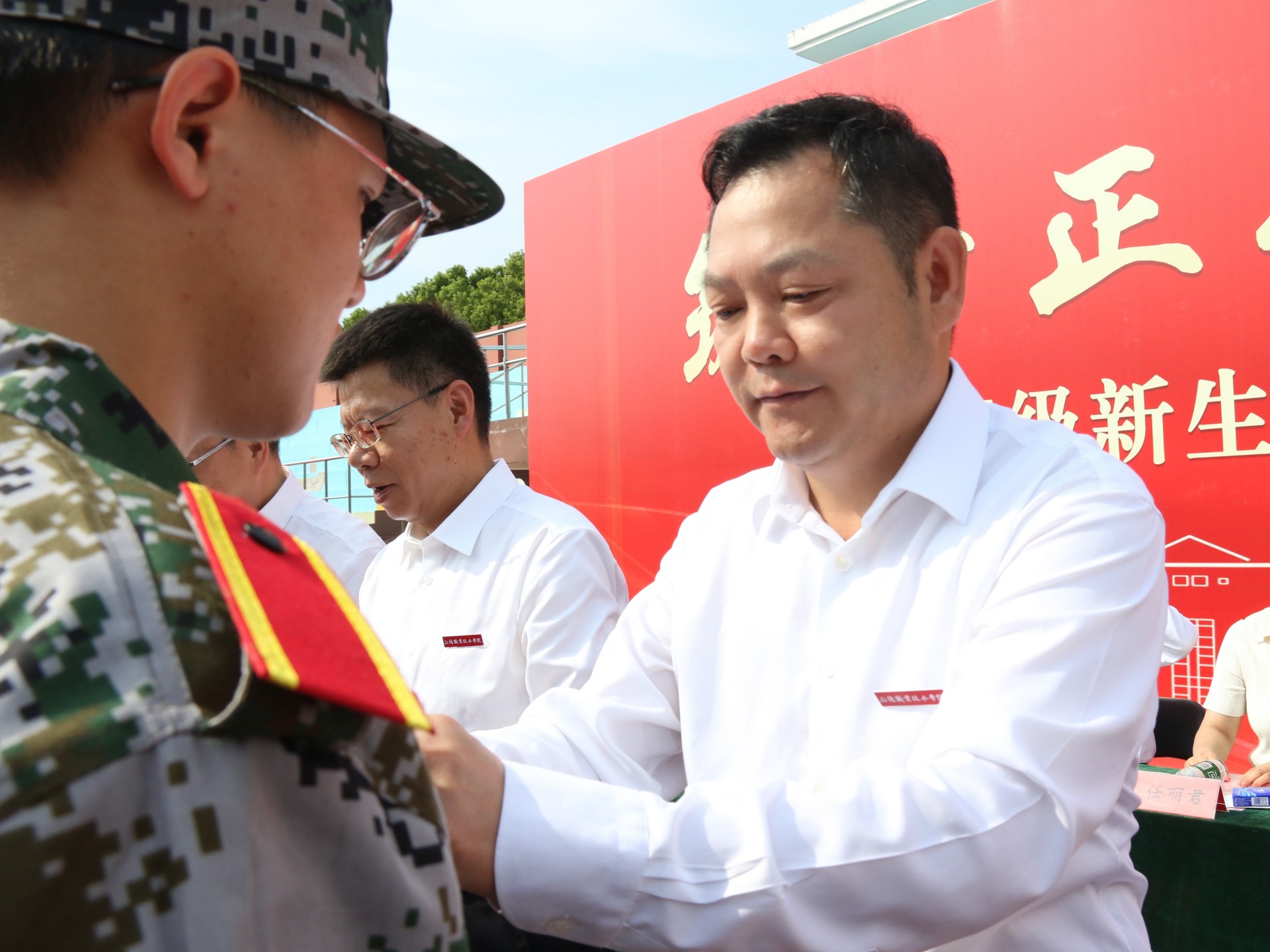 随后,院领导为新生代表佩戴校徽。全体新生整齐佩戴校徽,庄严宣誓:“做一名勤于学习、善于创造、甘于奉献、勇于担当、怀揣梦想的正德人”,誓言铿锵有力,彰显新生风貌。