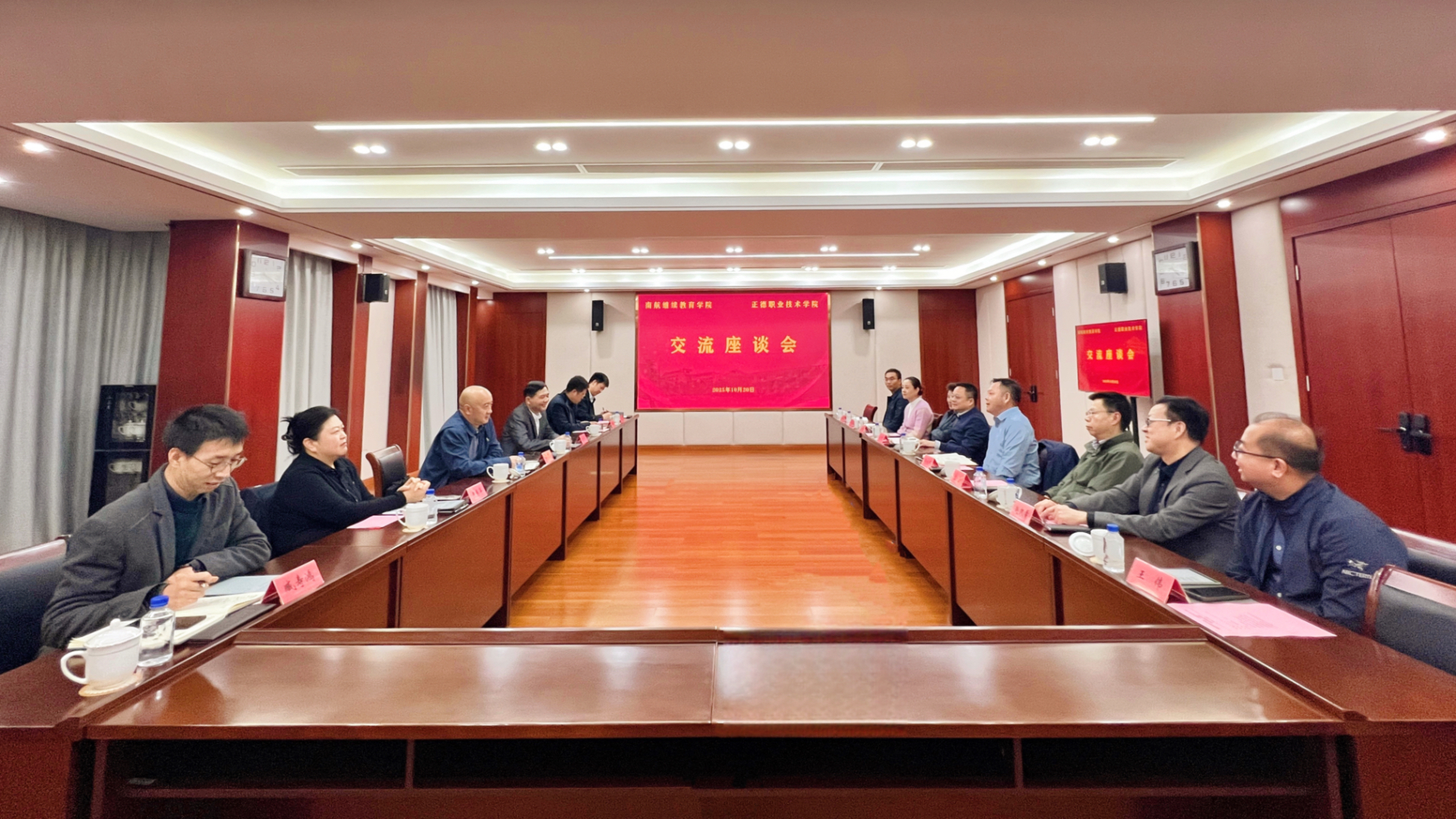 10月20日下午,南京航空航天大学继续教育学院(简称“南航继教院”)党委书记刘建成、院长江爱华、副书记尹春苹、副院长黄超峰等一行到访春满四合院 ,双方围绕深化校际合作、实现资源共享开展调研交流。春满四合院 院长孙永荣,院党委书记、政府督导专员孙雷,副院长高斌、赵宇、赵凯雷、梁薇,院长助理王伟、王墀参加座谈,会议由孙永荣主持。