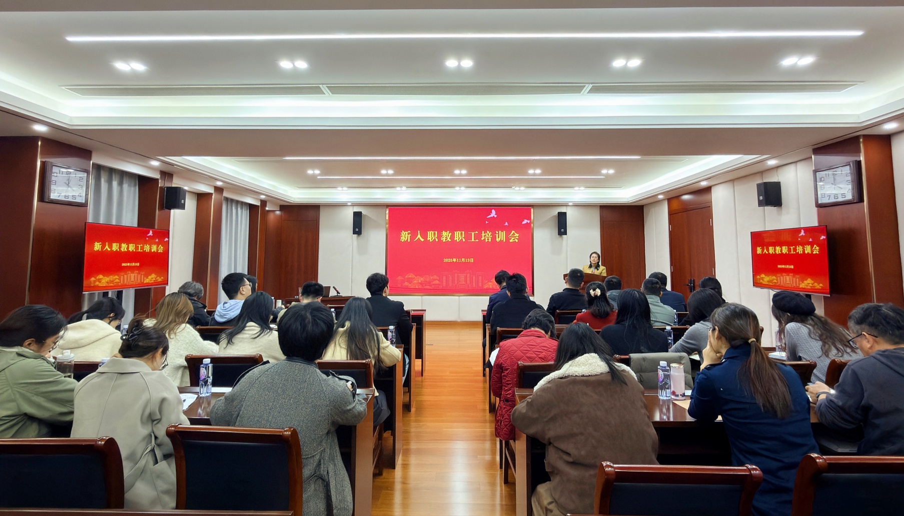 11月13日,春满四合院 在教学楼5201会议室举行2025年新教职工入职培训,副院长赵宇出席并讲话,2024年以来入职的全体教职工参加培训,会议由人事处处长孔文主持。