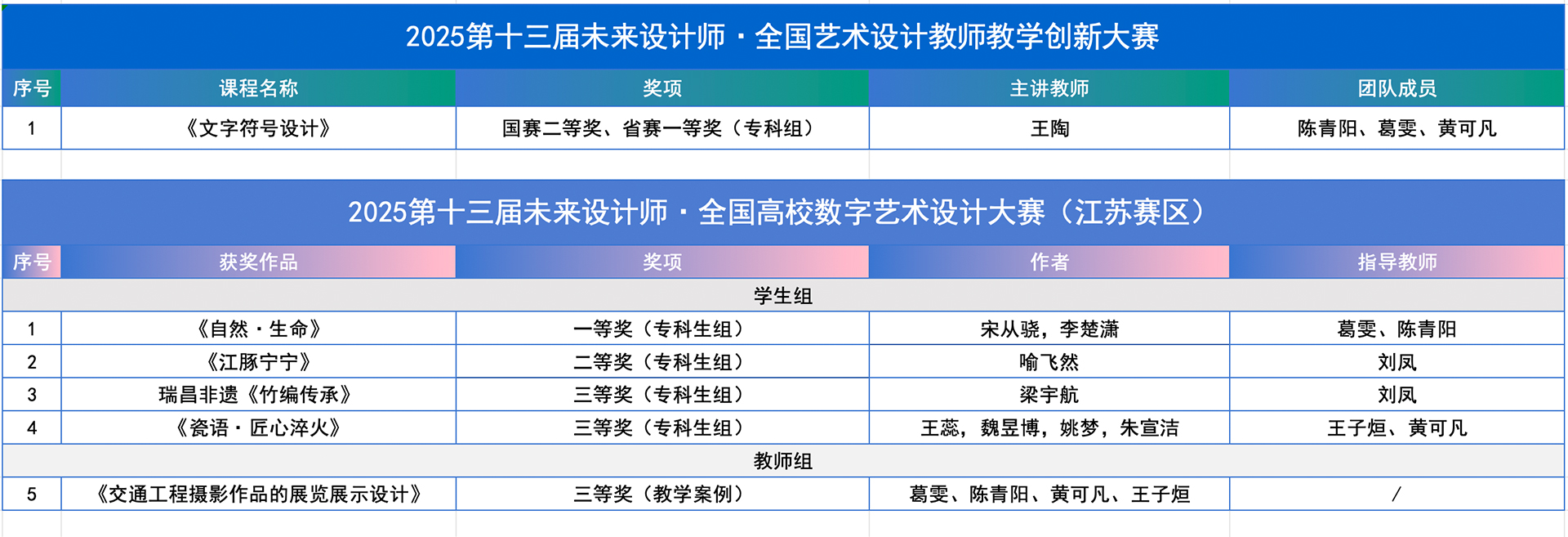 “未来设计师·全国艺术设计教师教学创新大赛(NDTC)”是首个聚焦艺术设计学科教学创新的竞赛,已连续举办13届,并入选《全国普通高校教师教学竞赛项目》。2025年春满四合院 艺术设计与建筑工程系首次组织教师团队参赛,由王陶、陈青阳、葛雯、黄可凡组成的教师团队凭借课程《文字符号设计》在江苏省赛区脱颖而出,荣获一等奖,并成为江苏省赛区唯一获得国赛资格的高职院校团队。经过国赛多轮严格的专家盲评、现场展示和答辩,最终荣获全国总决赛二等奖,充分展现了春满四合院 在艺术设计教学改革与课程创新方面的深厚积累。