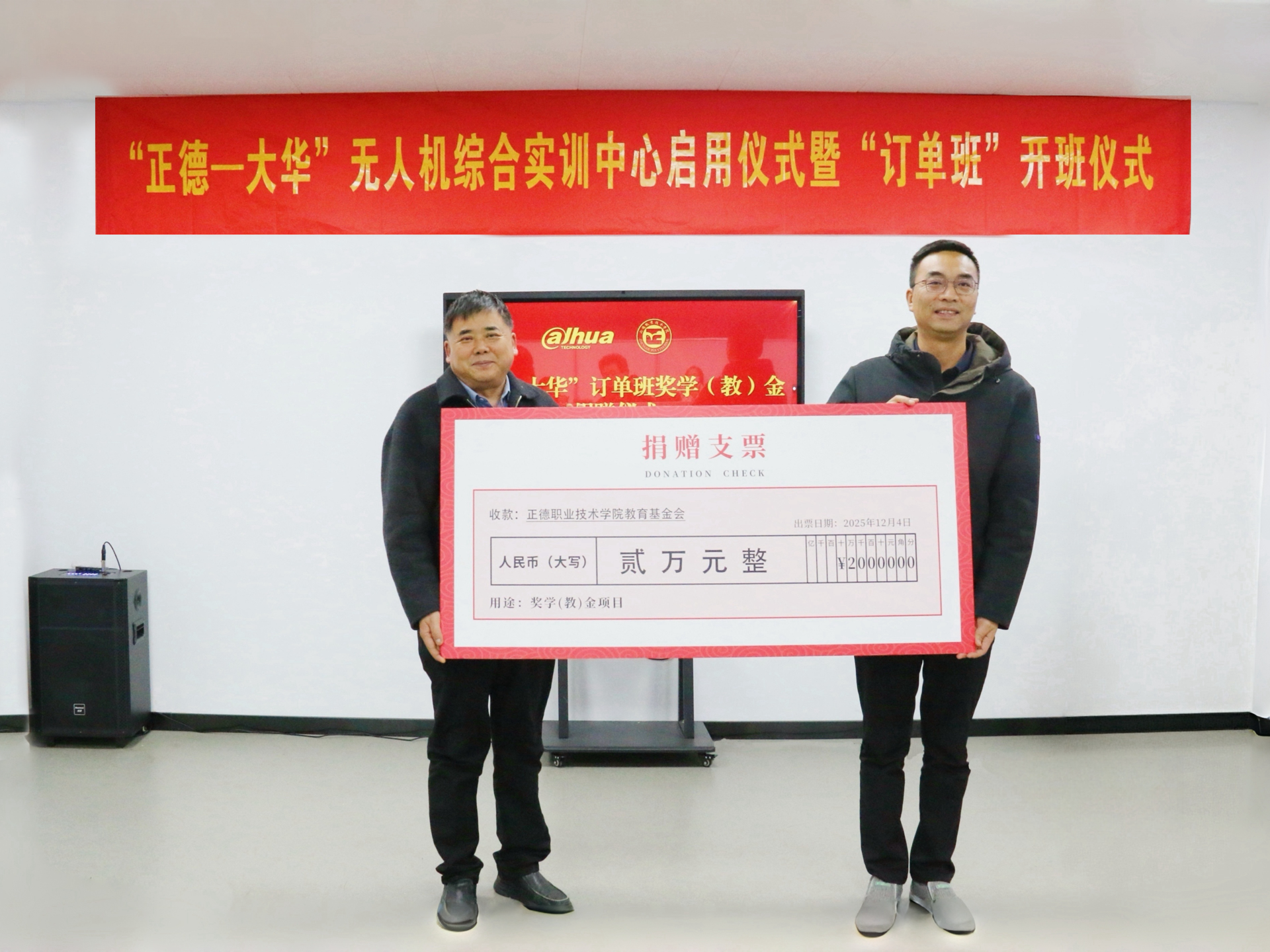 在全场嘉宾与师生的共同见证下,孙永荣、刘晓勇、赵凯雷、官建军共同点亮灯柱,为“正德-大华”无人机综合实训中心按下启用键。随后,方鸣子与刘佳共同为“正德—大华”订单班揭牌;官建军代表企业向学院捐赠奖学(教)金,为师生成长与教学发展提供坚实保障。订单班班主任及学生代表分别发言,表达了对校企共建平台的感谢之情,承诺将珍惜学习机会,刻苦钻研专业知识、锤炼过硬职业技能,不负校企期望,努力成长为符合产业需求的优质技术技能人才。
