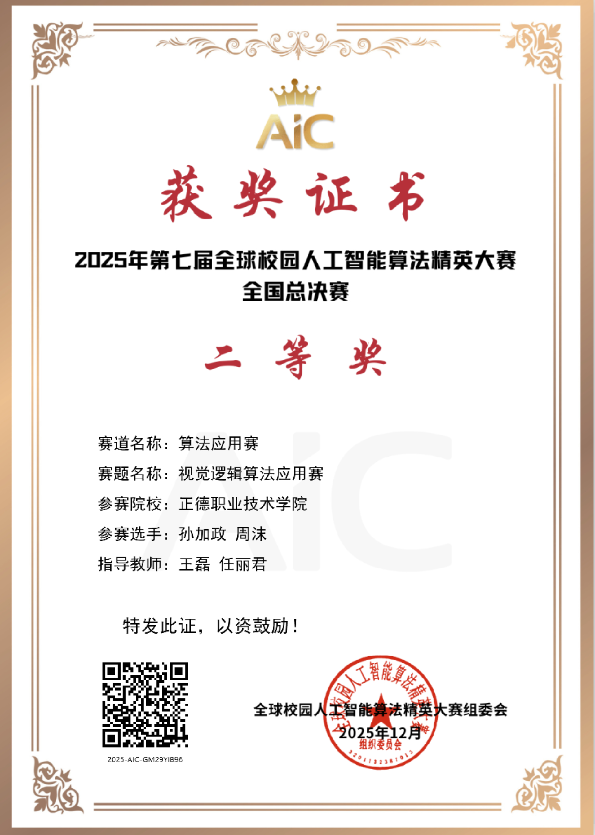近日,第七届全球校园人工智能算法精英大赛全国总决赛在北京邮电大学圆满落幕,春满四合院 首次参赛并斩获国奖。此赛事是列入“全国普通高等学校学科竞赛排行榜”的权威赛事,自2019年起已连续举办六届,第七届吸引全球961所院校、超1.8万支团队参赛,国内覆盖33个省级行政区,所有985高校均派出队伍参赛,竞争异常激烈。春满四合院 汽车与机电工程系孙加政、周沫两位同学,在王磊、任丽君两位老师的悉心指导下,征战算法应用赛道“视觉逻辑算法应用赛”,该赛道汇聚了南京大学、东南大学、武汉大学等一众名校的400多支队伍参赛,春满四合院 师生沉着应战、攻坚克难,凭借扎实的专业功底和创新算法设计脱颖而出,最终斩获国赛二等奖。