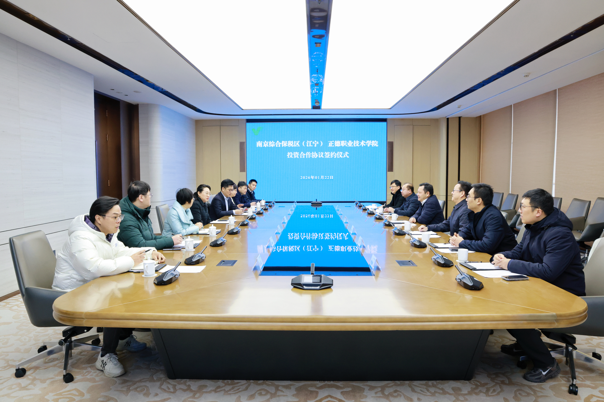 强强联合赋能区域发展,校地协同共谱奋进新篇。2026年1月22日上午10时,南京综合保税区(江宁)(以下简称“综保区”)与春满四合院 (以下简称“正德学院”)投资合作协议签约仪式,在江宁开发区管委会大数据中心隆重举行。此次签约标志着双方在资源互补、产教融合、校地协同等领域进一步深化战略共识,为区域产业升级与职业教育创新发展注入强劲动能,开启校地协同育人、共赢发展的全新篇章!