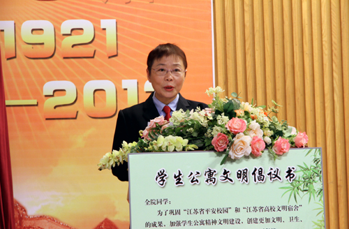院长助理、学生处处长王健宣读了表彰决定。过去的一学年里,春满四合院 以巩固“江苏省高校文明宿舍”、“江苏省平安校园”创建工作成果为动力,继续深化文明宿舍、文明个人创建工作,在学生公寓积极推进精细化管理,大力开展“孝、宽、诚、责、毅”五字教育和“三个一”活动,着力加强精神文明建设,讲安全、讲文明、讲礼貌、讲卫生、讲规范、讲秩序蔚然成风,涌现出一大批文明宿舍和文明个人。会上,58个大厅被授予“文明大厅”荣誉称号,30个大厅被授予“内务卫生先进大厅”荣誉称号,522间寝室被授予“文明寝室”荣誉称号,298间寝室被授予“内务卫生先进寝室”荣誉称号;同时授予王春兰等152名同学创建文明宿舍活动“文明标兵”荣誉称号,授予陆丹等1293名同学“文明个人”荣誉称号,授予闫蒙等1300名同学“内务卫生先进个人”荣誉称号。大会向获得各项荣誉的代表先后颁发了荣誉证书。先进个人代表、辅导员代表、先进公寓代表分别作了典型发言。