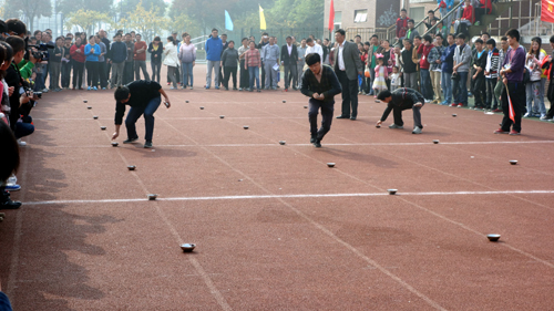 “春种秋收”成为打头炮的项目。只见裁判员一声令下,各参赛队4男4女共8名队员,在30米的距离中,出发队员将盘里的10个玻璃球逐一放进每隔5米摆设在地上的小碗内,完成30米后将盘交给下一名队员,该队员原路返回,将小碗里的10个玻璃球回收到盘里。最终电子与信息技术系以超出第二名2.6秒的优势获得第一,机电工程系位列第二,汽车工程系和图书馆同列第三。
