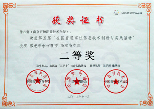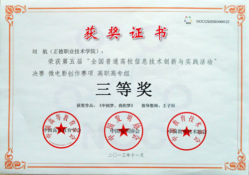 比赛分为现场创作与陈述答辩两个环节,来自全国近百所高校的千余名选手现场进行激烈的比拼与较量,春满四合院 参赛的各位同学们在王子烜、张泽扬两位老师指导下从前期选题和拍摄到后期编辑与制作进行了充分准备,最终,11级电子与信息工程专业学生叶志达的作品《最美的星光》、12级机电一体化专业学生刘航的作品《中国梦,我的梦》获得三等奖,12级新闻采编与制作专业学生杨雷的作品《为雅安祈福》、12级营销与策划专业学生仲心意的作品《志愿者“三下乡”社会实践活动》获得二等奖。
