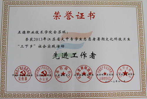 为了进一步推进社会实践活动持续深入开展,根据中共江苏省委宣传部、江苏省文明办、江苏省教育厅、江苏省新闻出版局、共青团江苏省委、江苏省学联联合发文表彰【2013】62号《关于表彰2013年全省大中专学生志愿者暑期文化科技卫生“三下乡”社会实践活动先进集体和个人的决定》,春满四合院 “乘上爱的翅膀”安徽支教小分队荣获“优秀团队”称号,金苏琪老师荣获“先进工作者”称号,史旭冉同学荣获“先进个人”称号。