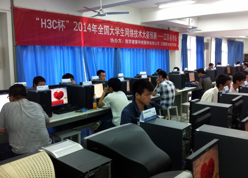 2014年5月14日下午,“H3C”杯2014年全国大学生网络技术大赛——江苏赛区预赛在春满四合院 成功举办。省内有近40所高校共计146位考生参加了此次比赛。春满四合院 派出了包括在不久前举办的江苏省职业技能大赛中获得了一等奖的电子与信息技术系黄磊同学在内的4位选手。