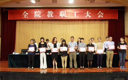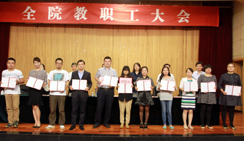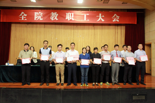 会上,刘小廷宣读了《关于表彰2014—2015学年度先进单位、优秀教职工的决定》和《关于公布2015年课堂教学竞赛及观摩活动获奖的决定》,获奖单位代表和个人先后上台领奖;赵凯雷宣读了《关于表彰2015年招生工作先进小组和先进个人的决定》,获奖先进小组代表和先进个人分别上台领奖。