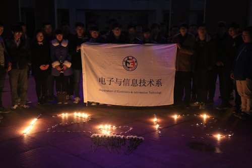 晚上七点,各团支部在团支书的带领下自发组织烛光祭奠活动,用蜡烛摆放成心形和1213字样,纪念在南京大屠杀惨剧中死去的亡魂,并告诫自己:“牢记历史,勿忘国耻,努力学习,振兴中华”。