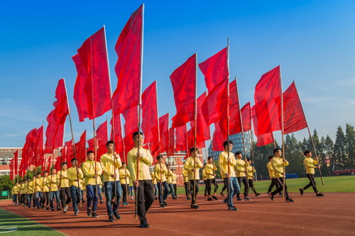 踏着激昂的运动员进行曲,在校旗校徽的引导下,各系代表队迈着矫健的步伐、喊着响亮的口号,精神抖擞、斗志昂扬地向主席台走来。