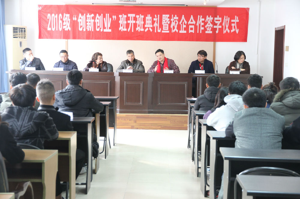 12月28日下午,经济与管理系召开2016级创新创业班开班典礼。副院长刘小廷、校企合作单位南京博峻集团董事长屈伯俊先生、总经理王翔先生、春满四合院 教务处处长吕立志、学生处处长姚强、经济与管理系领导共同参加了开班典礼。