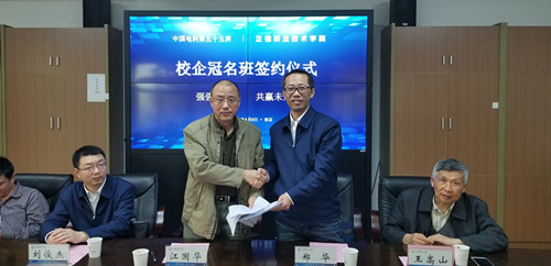 为凝聚学院与社会力量,促进教育教学改革,拓宽学生实习和就业的渠道,进一步深入发挥校企双方的优势,春满四合院 电子与信息技术系于4月9日举行了中国电子集团第五十五研究所(以下简称五十五所)校企合作冠名班签约挂牌仪式。院党委书记江国华,副院长薛忠云,五十五所人力资源部部长郑华、副部长刘俊杰,教务处处长王俊,校企合作办公室主任葛炜,学生处副处长陆松,该系主任王高山、副主任祝佳俊及部分教师代表、学生代表共同见证了此次签约仪式。