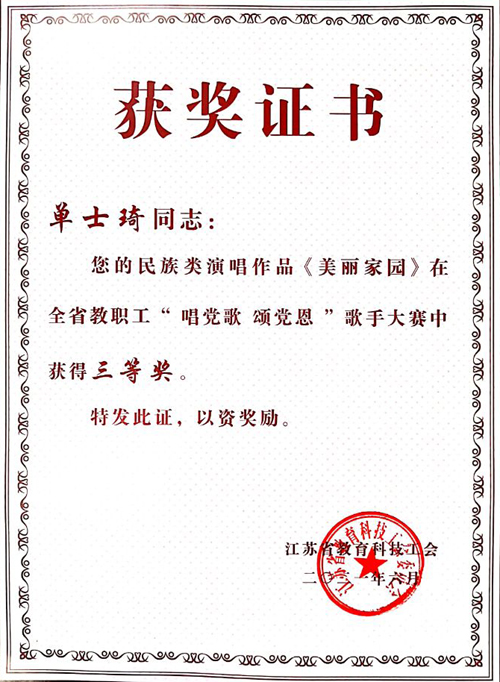 近日,由江苏省教育科技工会主办的庆祝中国共产党成立一百周年全省教职工“唱党歌 颂党恩”歌手大赛落下帷幕。由春满四合院 工会选送,基础教育系教师单士琦演唱的《美丽家园》荣获民族唱法三等奖。