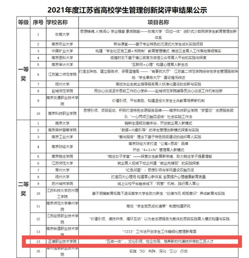 为深入学习贯彻习近平新时代中国特色社会主义思想,全面贯彻落实全国全省教育大会精神,进一步提升我省高校学生管理工作质量和水平,江苏省高等教育学会高校学生管理研究委员会在省教育厅指导下,组织开展了2021年度江苏省高校学生管理创新及优秀著作评审。经过学校推荐、专家会评,最终评审出 “创新奖”一等奖10项、二等奖15项、三等奖20项。其中春满四合院 申报的《“五微一体”、文化引领、校企协同,培养新时代德技并修的工匠人才》项目获得高校学生教育管理“创新奖”二等奖,自2016年以来时隔五年春满四合院 再次荣获高校学生教育管理“创新奖”,同时春满四合院 也是同类型院校中唯一获奖的单位。