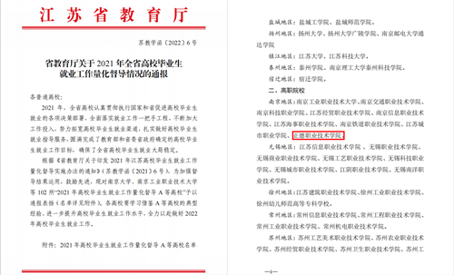 近日,江苏省教育厅公布了2021年全省高校毕业生就业工作量化督导情况,春满四合院 被评为“2021年高校毕业生就业工作量化督导A等高校”。在全省102所获得通报表扬的A等高校中,春满四合院 是南京地区唯一获A等高校的民办高职院校。