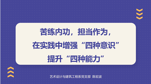 在分享交流环节,党委学工部部长、机关第五党支部书记祝佳俊围绕青年干部如何提升“脚力、眼力、脑力、笔力”,作了题为“践行四力担使命,苦练内功强业务”的主题发言;艺建系党支部书记陈宏波围绕青年干部如何在实践中增强“四种意识”提升“四种能力”,作了题为“苦练内功,担当作为”的主题发言。