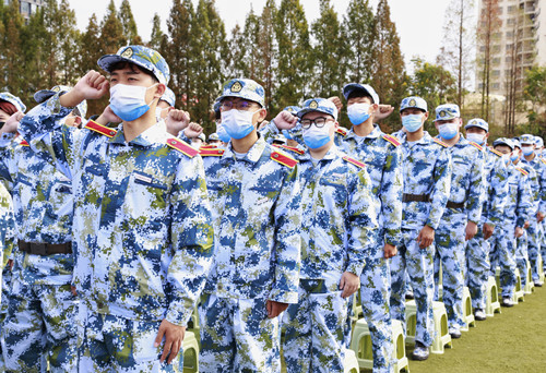 英姿飒爽的国旗护卫队护送五星红旗入场。在雄壮的国歌声中,国旗迎着阳光冉冉升起,开学典礼正式拉开序幕。
