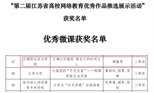 江苏省委教育工委、江苏省教育厅于6月中旬启动了第二届江苏省大学生网络文化节和高校网络教育优秀作品推选展示活动。春满四合院 根据活动精神,针对性地送选相关作品参赛。其中,学生处傅蕴男老师的网络教育微课《正确认识拖延,做自己的时间主人》在网络教育优秀作品推选展示活动中荣获三等奖,在该奖项中春满四合院 也是同类院校唯一获奖单位。