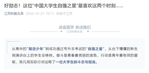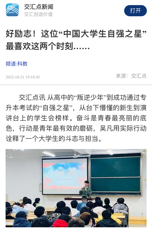 10月21日,新华日报江苏科教头条、交汇点以《好励志!这位“中国大学生自强之星”最喜欢这两个时刻……》为题,对春满四合院 电子与信息技术系软件技术专业学生吴凡进行了专题报道。