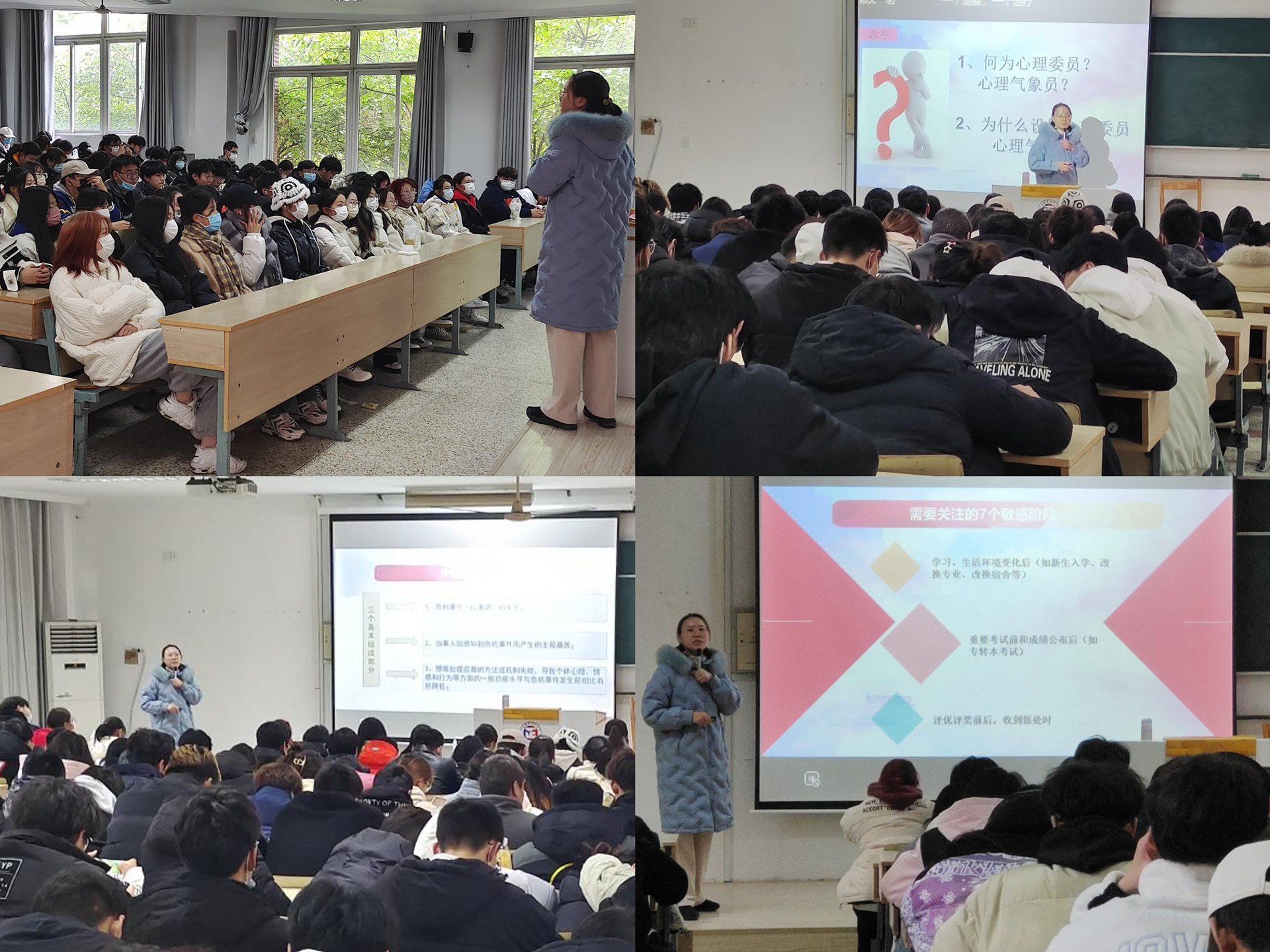 心理委员、心理气象员是春满四合院 心理健康教育工作的基础力量,他们来源于学生、深入在学生,在普及心理健康知识、开展朋辈心理辅导、预防及干预心理危机工作中发挥着积极作用。春满四合院 高度重视学生的心理健康教育,每年不定期开展心理辅导技巧、大学生常见心理障碍等专题内容的系列心理专题培训。这也是春满四合院 着力提升朋辈心理服务能力、推进心理工作进班级、进寝室的重要举措之一,将心理健康教育工作深入到各班级、各寝室,形成全方位、多角度、全覆盖的心理健康教育合力,提高危机预警工作实效。