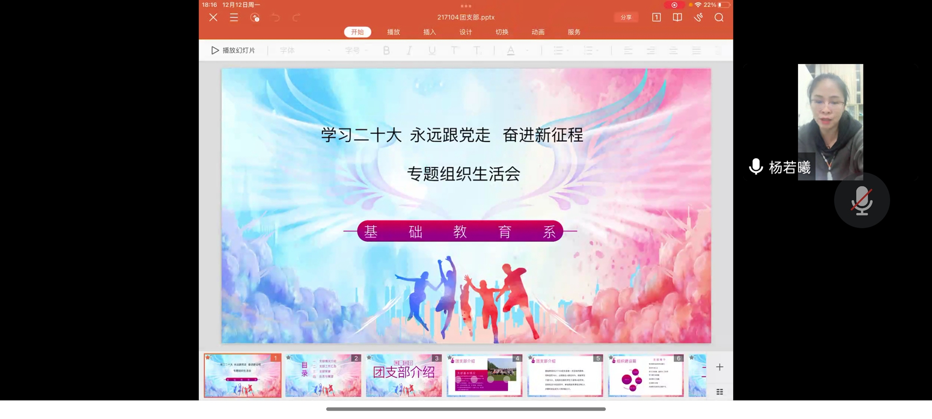 为深入学习贯彻党的二十大报告和党的二十大精神,紧密联系团员思想学习工作实际,交流学习体会,对标先进标准、查找差距不足、激发责任担当,教育引导广大团员青年厚植爱党、爱国、爱社会主义的情感,树立远大理想,增强奋斗精神,争当中华民族伟大复兴的生力军。根据院团委相关工作部署,12月12日,基础教育系开展“学习二十大、永远跟党走、奋进新征程”专题组织生活会,我系团员青年在线参加此次活动。