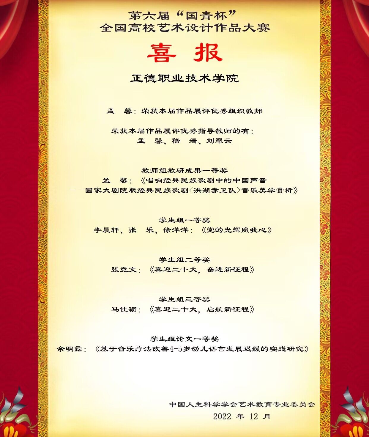 在近期举办的第六届“国青杯”全国高校艺术设计作品大赛中,基础教育系师生取得优异成绩,孟馨获教师组教研成果一等奖,余明露获学生组论文一等奖,李晨轩等、张竞文、马佳颖分别获学生组美术作品一、二、三等奖,孟馨、嵇姗、刘翠云获优秀指导教师奖。