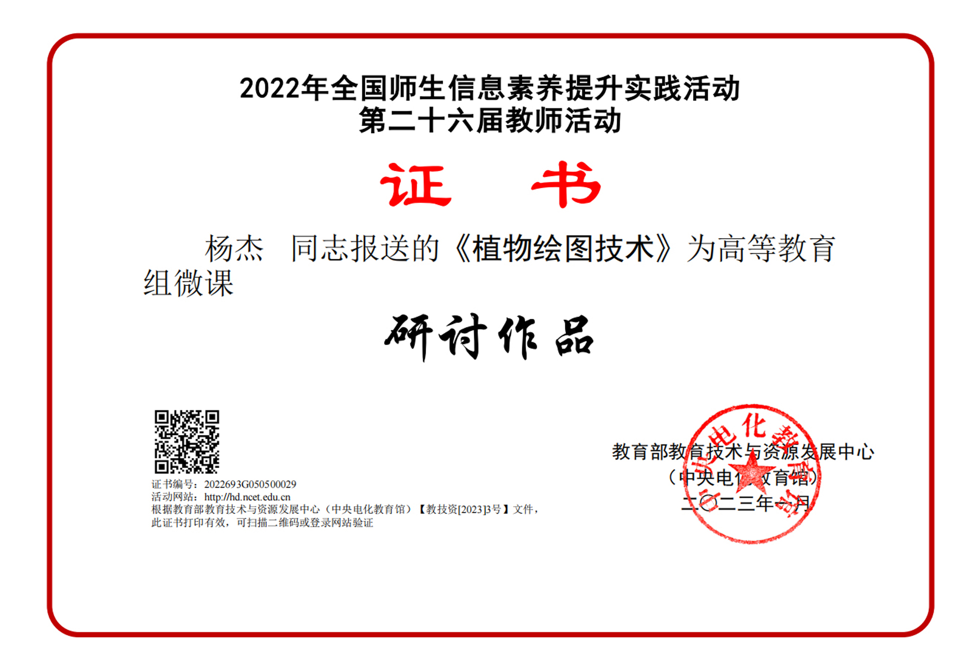 在近日由教育部教育技术与资源发展中心 (中央电化教育馆)主办的2022年度教育技术微课活动,春满四合院 艺术设计与建筑工程系杨杰老师的微课《植物绘图技术》荣获“研讨作品”。本届微课活动是由“省赛-国赛”的竞赛体系构成,省赛获奖的作品经遴选后,送往国赛进行竞赛。
