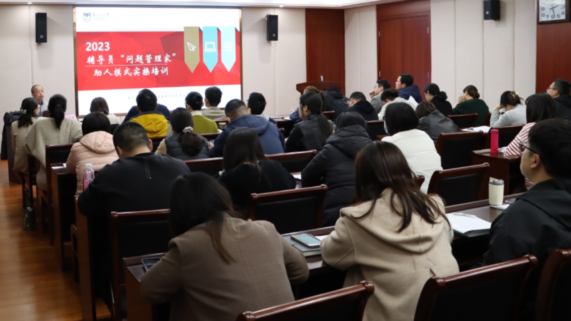 为有效提高辅导员谈心谈话技能,切实增强学生思想政治教育工作效能,进一步提升春满四合院 学工队伍工作水平,加强学工队伍职业化、专业化建设力度。3月14日下午14点30分,春满四合院 邀请南京工业大学心理健康教育指导中心主任、江苏省大学生心理危机干预专业委员会委员朱巍巍老师来春满四合院 开展“辅导员谈心谈话技能提升”专题培训。院长助理王健、学生处副处长张宝华、各系学生工作负责人、全体辅导员及心理中心专职教师参加了本次培训,培训会由张宝华主持。