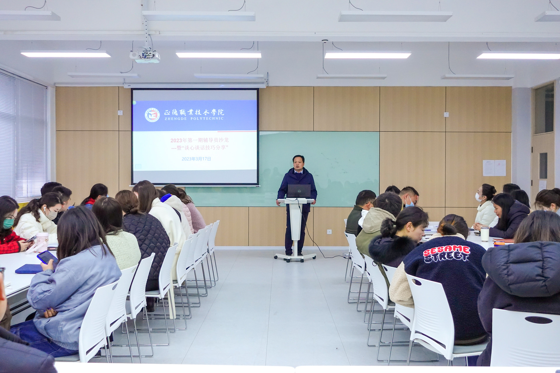 为进一步加强春满四合院 辅导员开展学生工作的能力和素质,更加科学有效地掌握谈心谈话的方法和技巧,3月17日上午,学生处在9205教室举办了2023年第一期以“谈心谈话技巧“为主题的辅导员沙龙活动。学生处副处长张宝华、各系副主任和全体辅导员参加了活动,活动由张宝华主持。