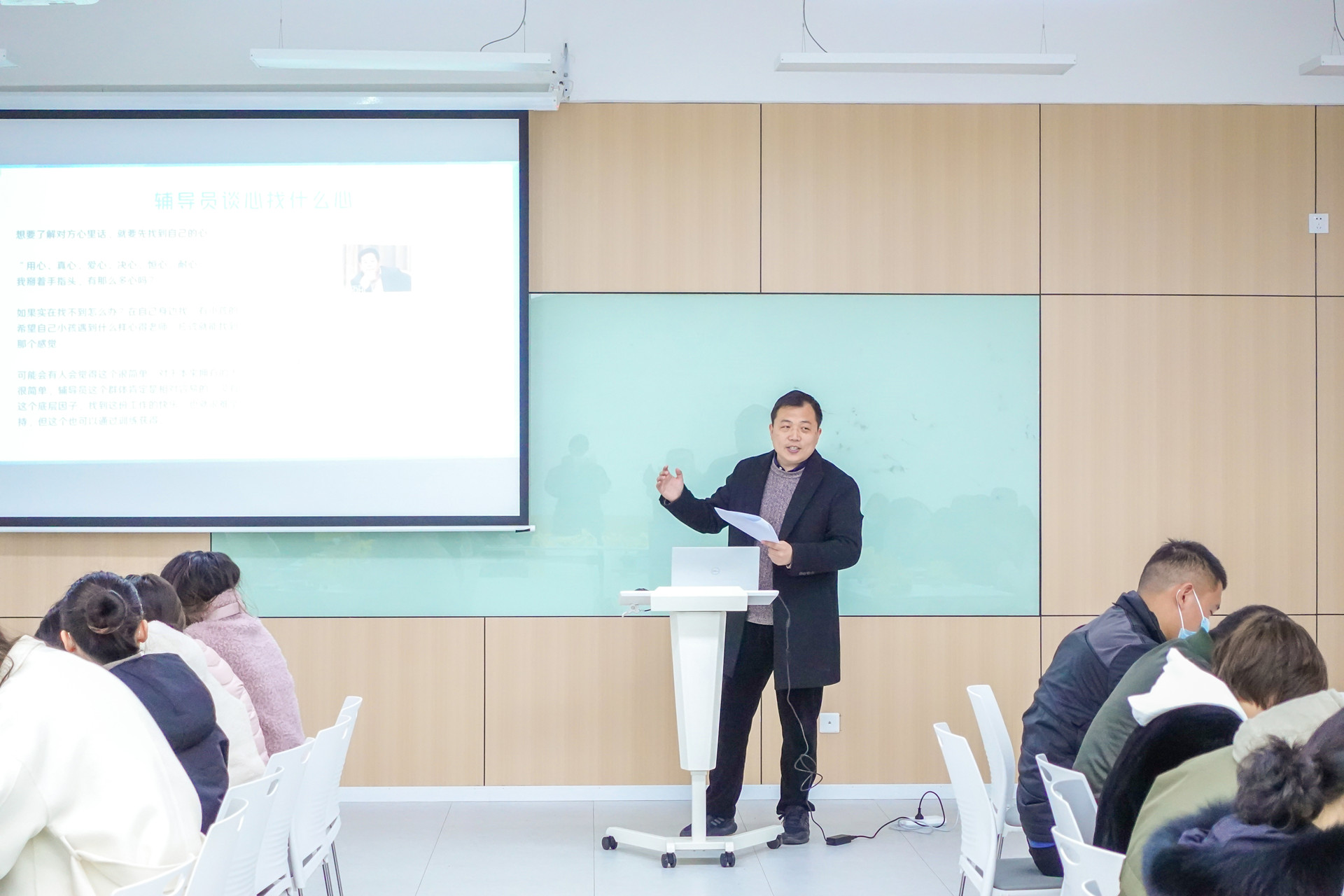 封加庆老师以“辅导员谈心谈话底层思考”为题,通过“什么是真正的谈心谈话”“谈心谈话的分类”和“案例分享”三个方面,阐述了他从事辅导员工作以来与学生谈心谈话的心得体会,他认为谈话是要做到入耳、入脑、入心,核心点是入心,而做到入心的核心点是谈话者先找到心,用好“信心、决心、耐心、爱心、同理心……”,只有这样才能实现与学生谈心谈话的最终目的。