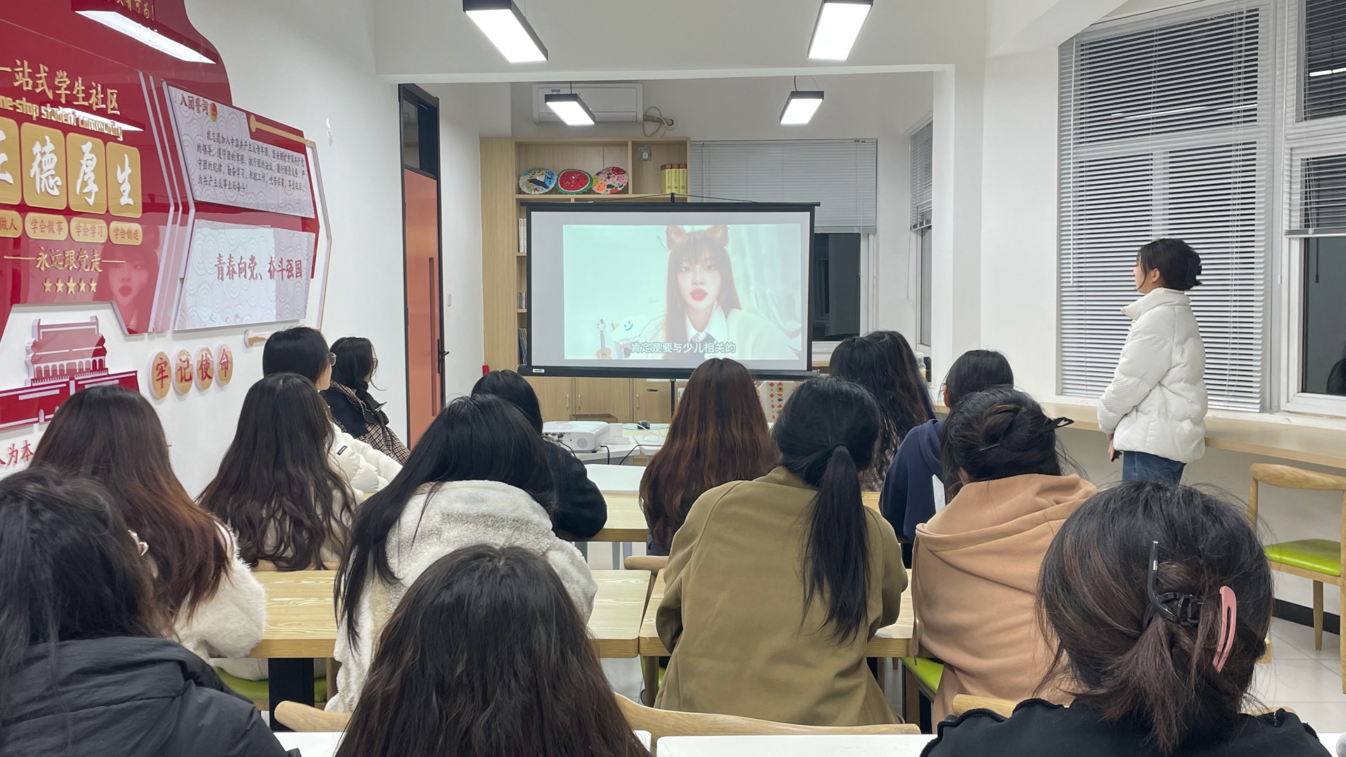 座谈会上单煜童同学介绍本次活动的目的,然后播放了由20级优秀学姐袁大双和陶晶精心录制的视频,与学妹们畅谈实习感想。