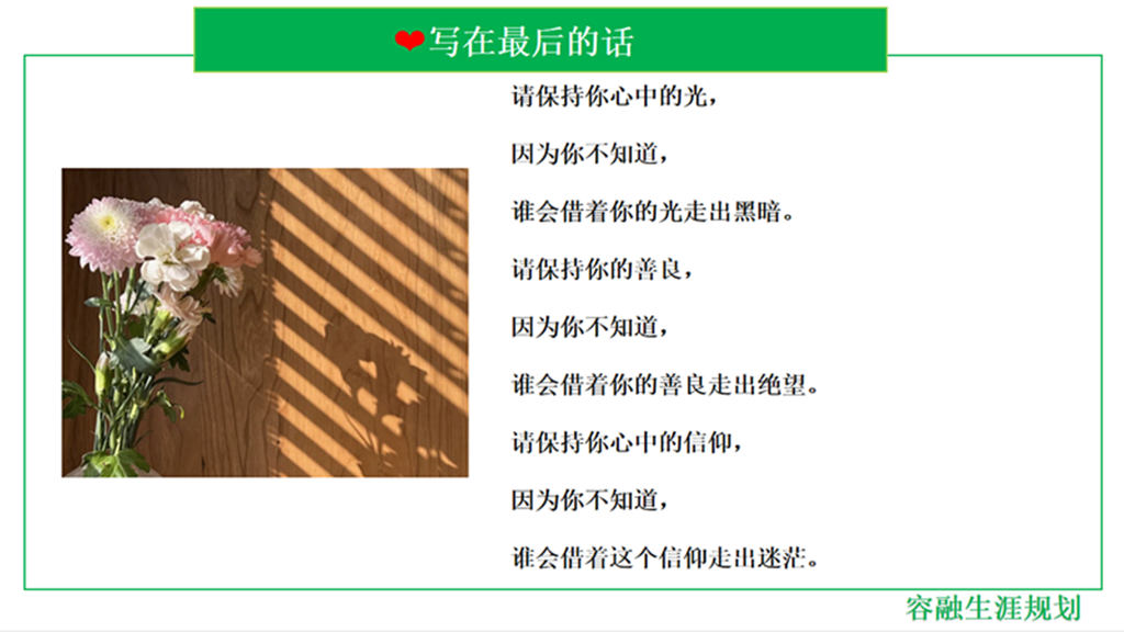 讲座的最后,彭老师用一首生涯育人小诗勉励在座的辅导员老师,让大家保持心中的光和信仰,去帮助每一个想走自己路的学生走出自己的人生之路。