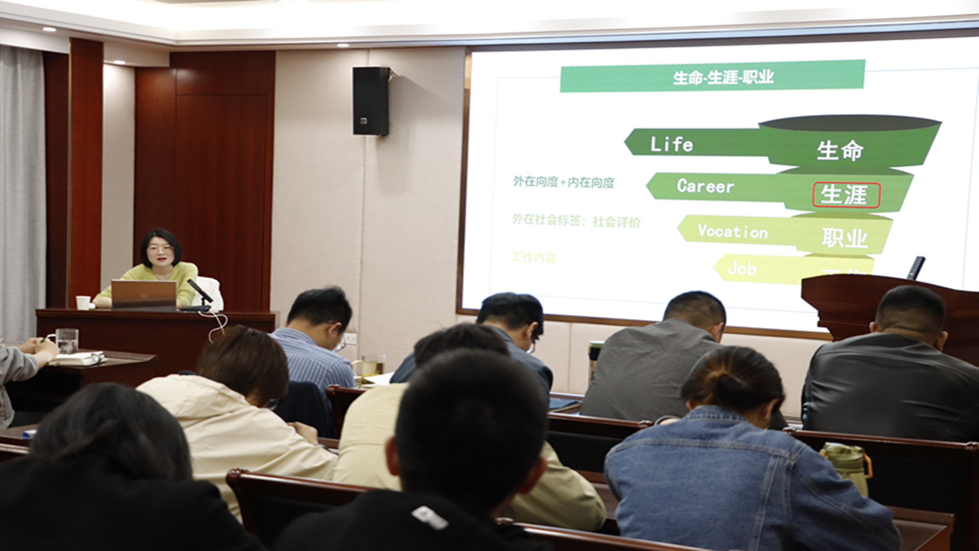 全体学工人员参加了此次培训,培训由学生处心理健康教育中心傅蕴男主持。本次培训邀请到了无锡城市职业技术学院的彭容容博士进行培训分享,彭博士从事一线学生工作多年,并成功创立了“容融生涯规划工作室”,其在生涯教育领域深耕多年,具有一定的影响力。