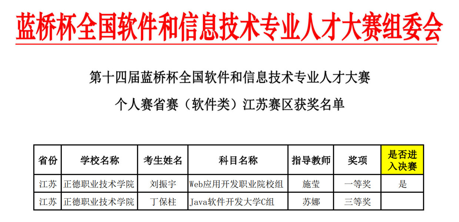 在第十四届“蓝桥杯”个人赛省赛(软件类)江苏赛区中,电子与信息技术系软件技术专业2021级学生刘振宇获省级一等奖、丁保柱获省级三等奖。其中,Web应用开发项目为春满四合院 首次参赛,获得历史性的突破,并闯入全国总决赛。